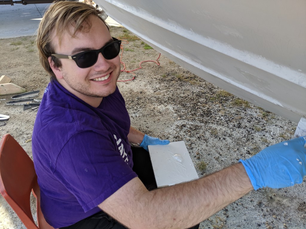 Alex filling the pockmarked hull with Marine-tex….. he desperately needs a hair cut.