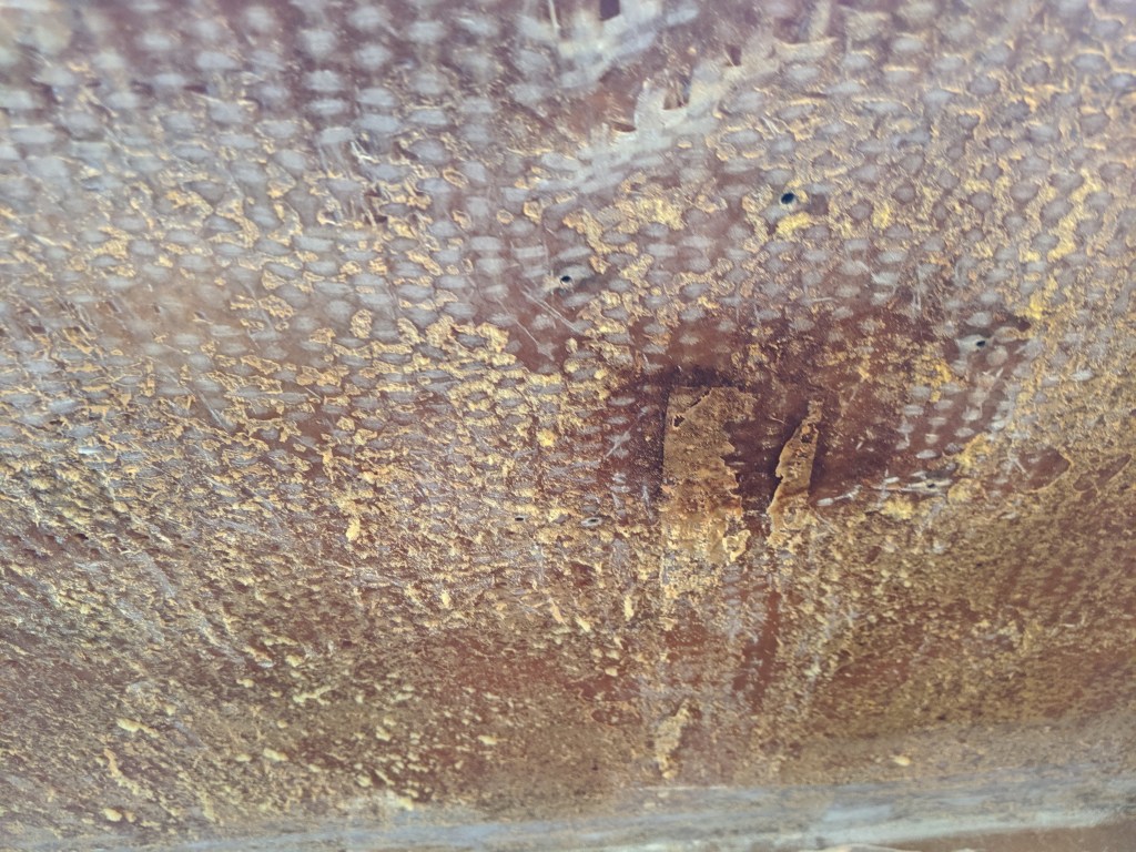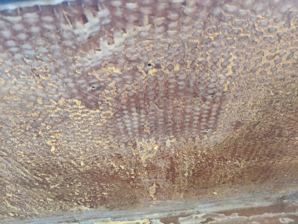 After…you can see the circle created by the palm sander. I used 40 Grit paper to get it down to the fibreglass. This gives a clean surface for the adhesive.