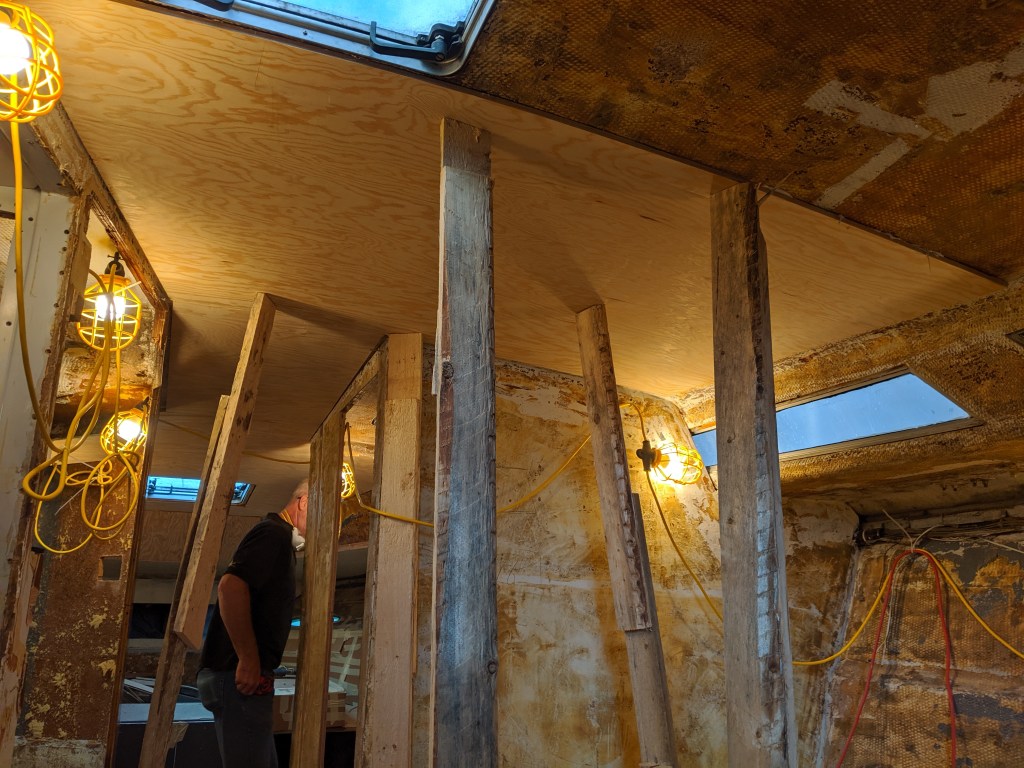 Most of the day was spent putting up the rest of the 1/2″ plywood on the ceiling. Got it all done.