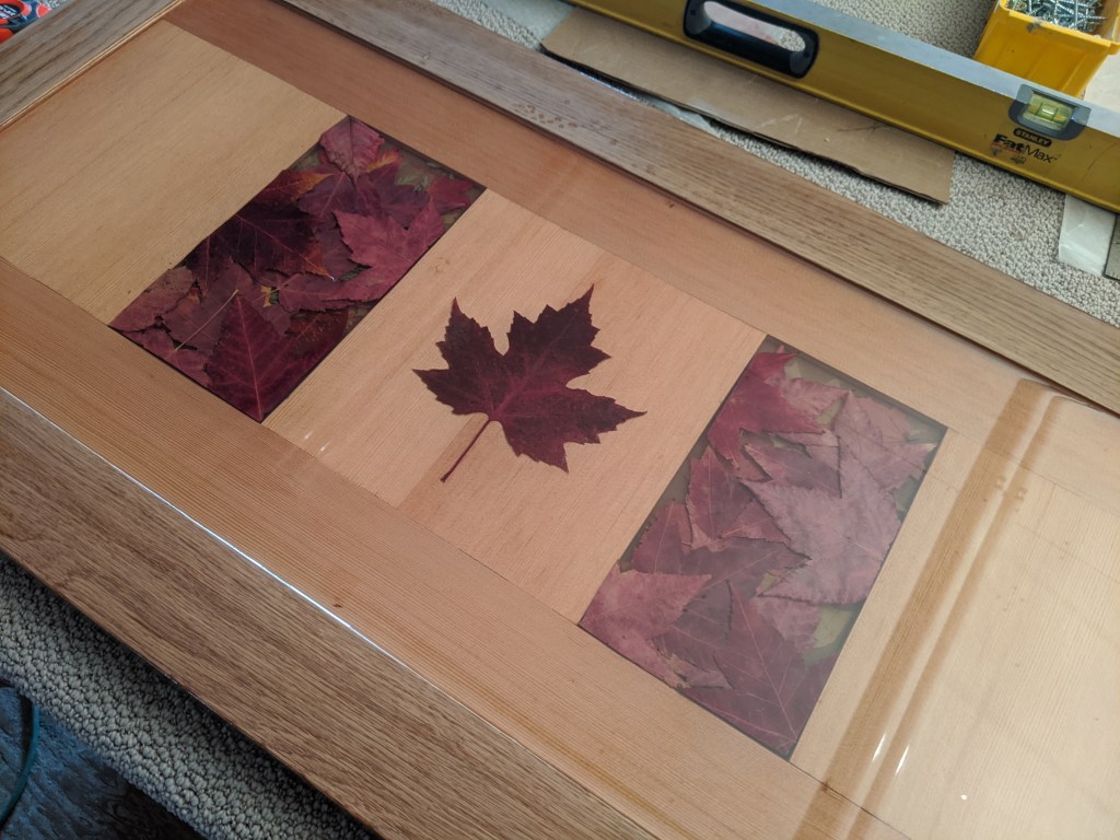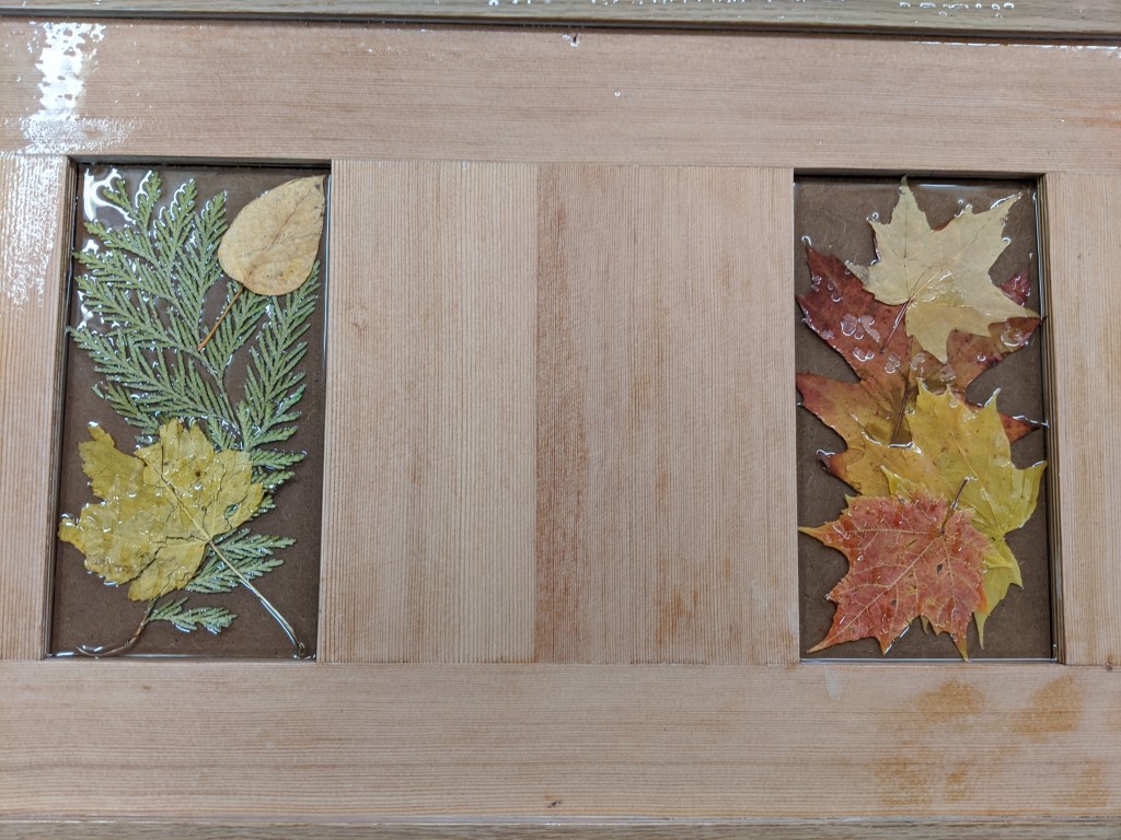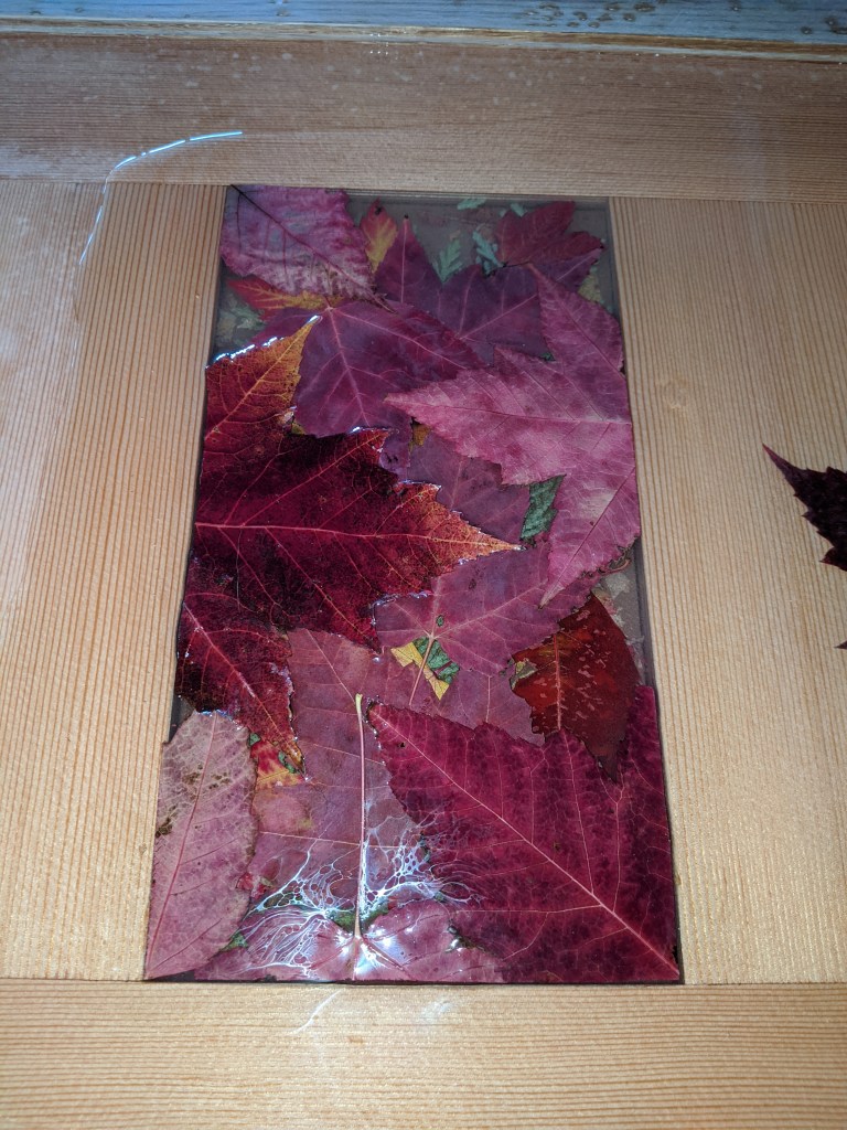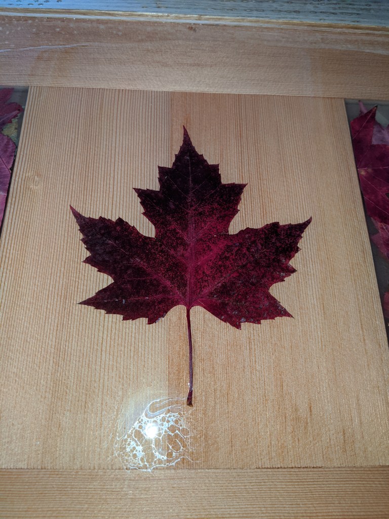 W.C. Fields said to never work with animals or children. I would like to add leaves and epoxy. In order to preserve leaves they should be ironed between sheets of waxed paper. This helps maintain the vibrant colours. It also leaches into epoxy. I am hoping that the next two coats will help minimize this. They also tend to move when the epoxy is settling so you have to keep repositioning them until it starts to cure. Still…I am very happy with the over all look.
