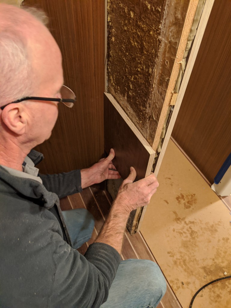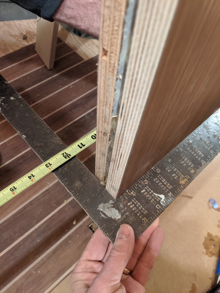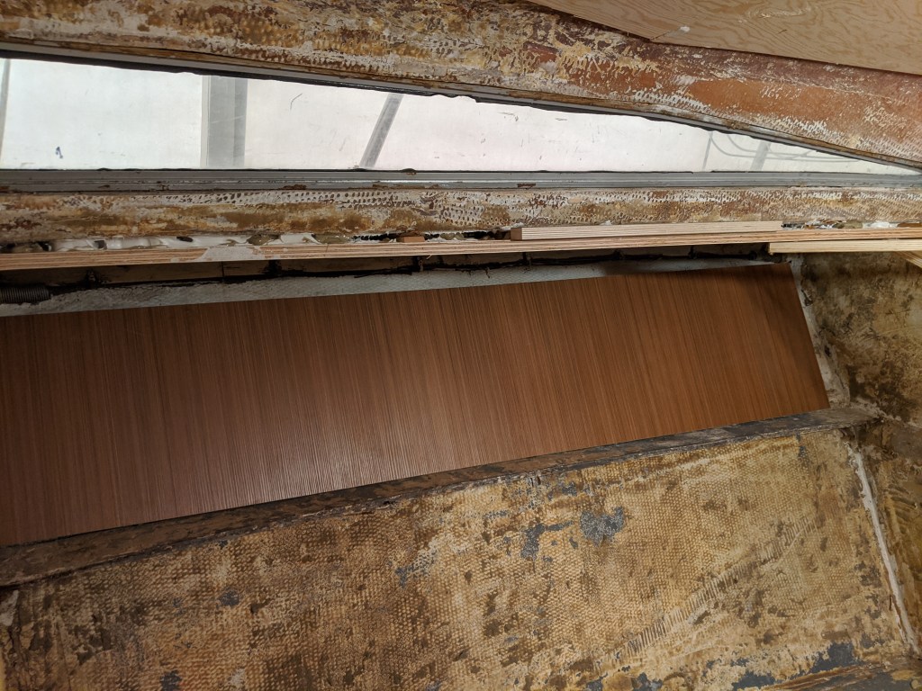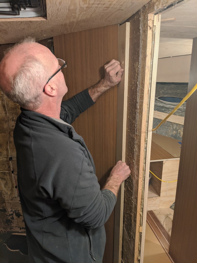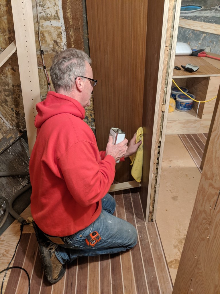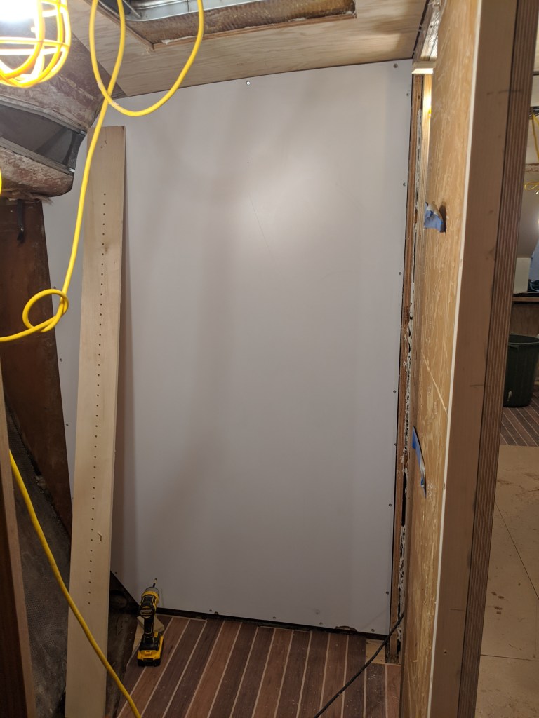 It took half the day to install five panels in the mid berth. Since we won’t be having any base to cover the gap at the finished floor…there can’t be a gap at the finished floor.