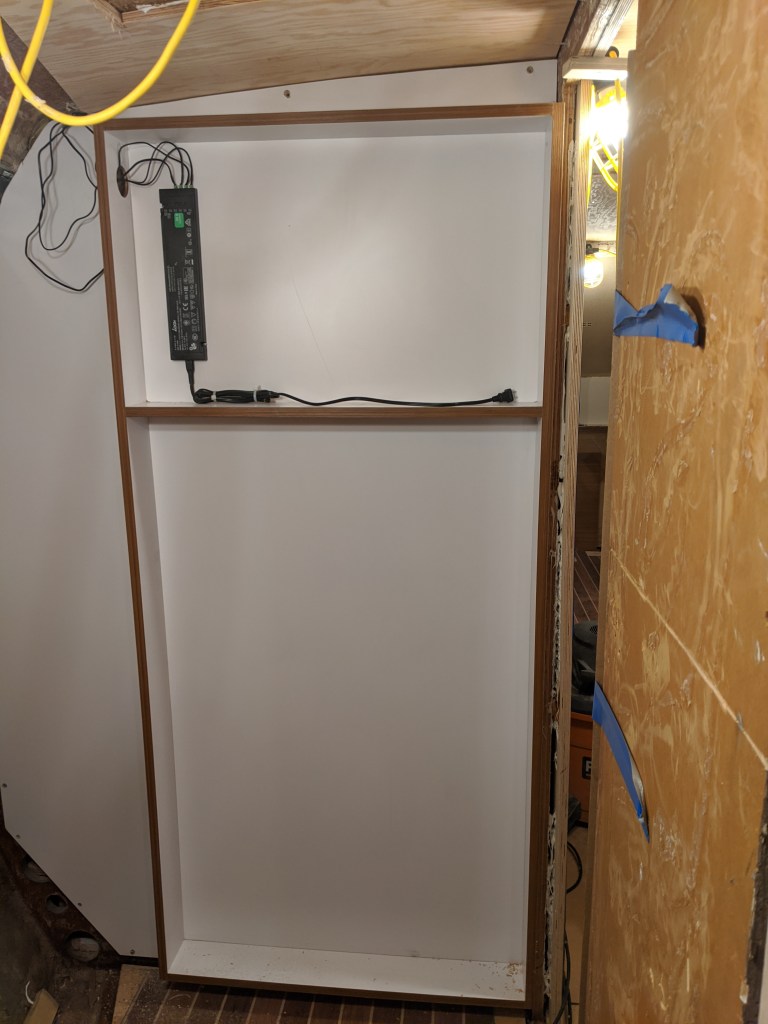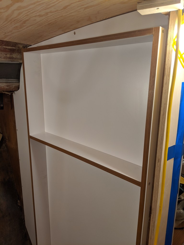 We then moved over to the former ensuite head. We decided to make this the entrance to the v-berth and will be installing some small storage cabinets here as well. One of these cabinets will be where we put the centre cushion for the drop down table in the eating area. This is where our second almost-full-size bed will be. In this photo we installed a white laminate panel to act as the back of the tall cabinet. It is only about 6″ deep including the door.