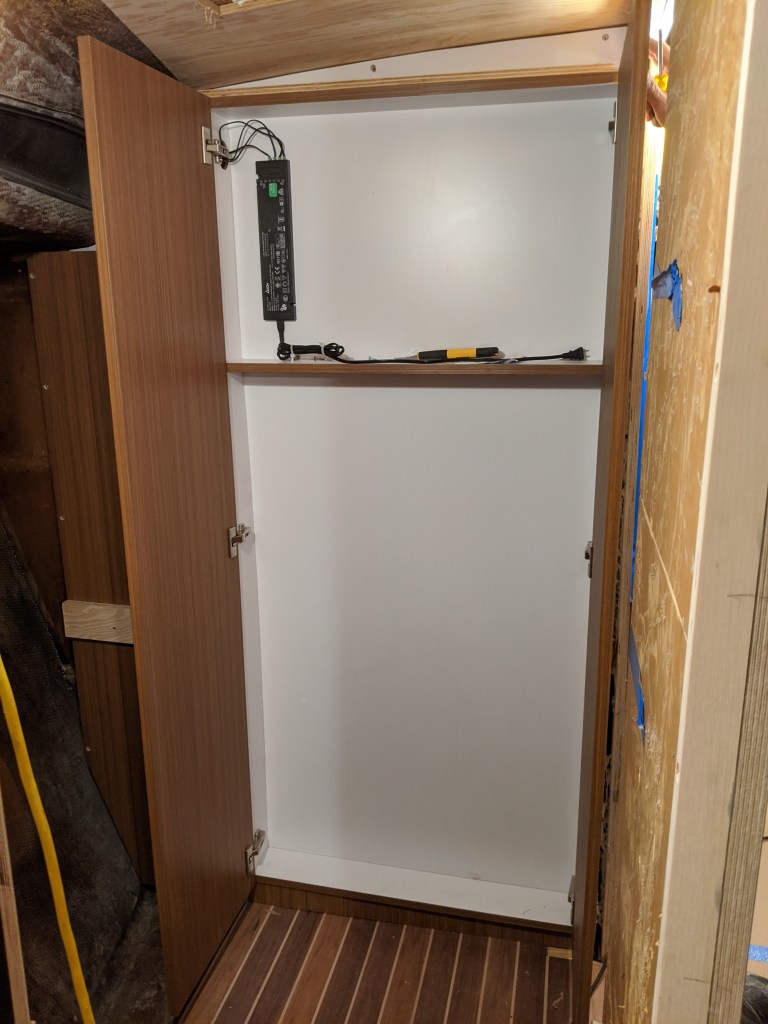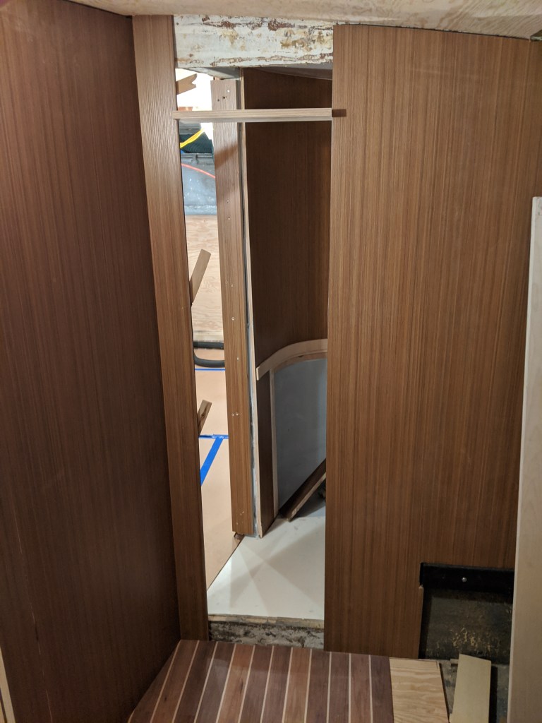 We decided to continue on with the storage area in the former ensuite head which is now referred to as the v-berth vestibule. Sounds very fancy. In the last post we built and installed the frame for the wall cabinet. This had to be a very shallow unit because we still had to be able to get into the area to enter the v-berth.