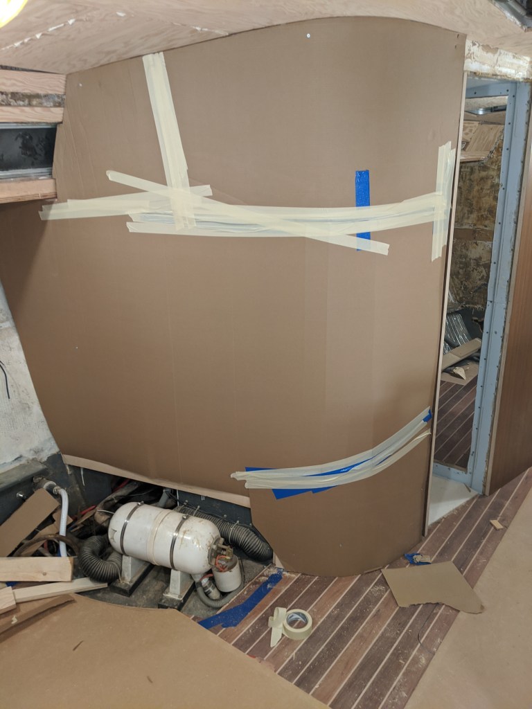 We also made a full size cardboard template for the curved wall. We still have one more layer of bendable plywood on before we finish it with plastic laminate. The template is critical here since we have to fit it to the floor and come within a 1/8″ of the ceiling. Not much room for error.
