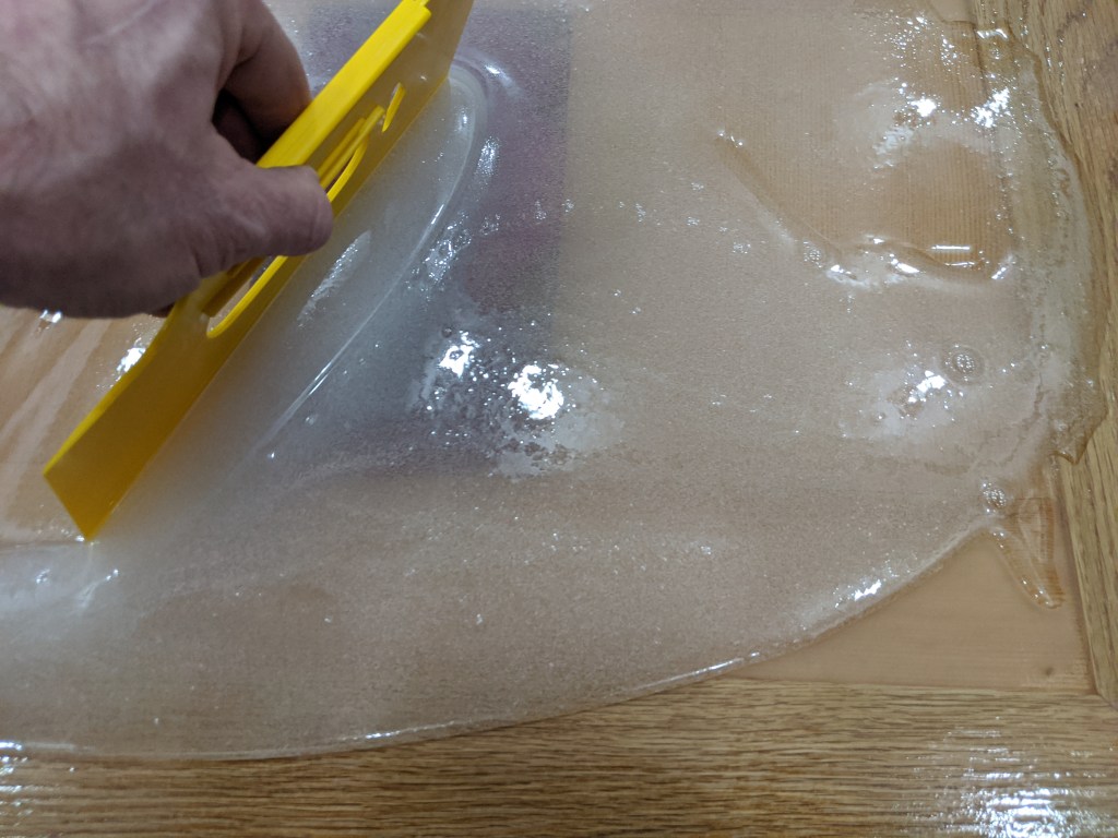 Thousands of tiny bubbles makes it almost opaque. Most of these will work themselves out but you will still need a propane torch for a lot of them. I used a new plastic scraper to even out the coat.