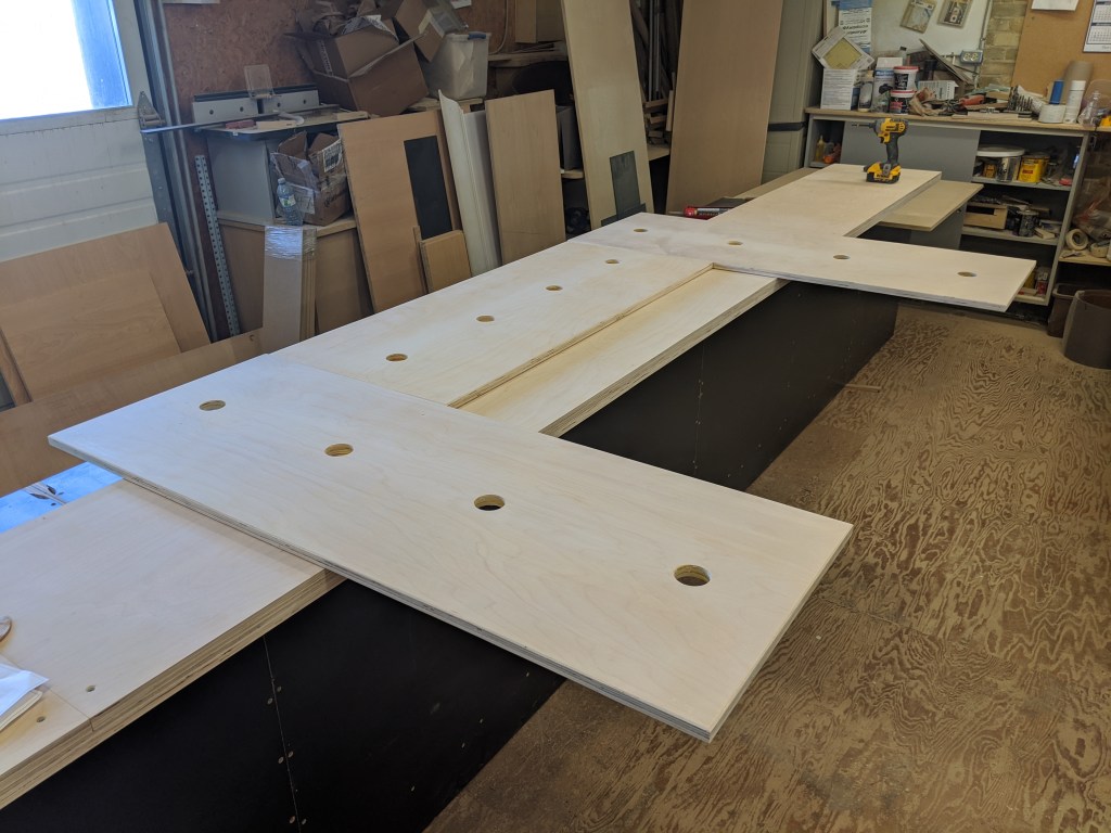 Donald made the plywood backing for the seating in the eating area. This will be going off to our upholsterer this week.