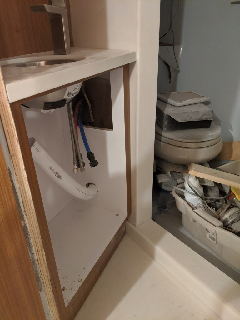 All we have left is to make a door for the cabinet, install the shower door, and trim out the glass panel to the mid-berth.