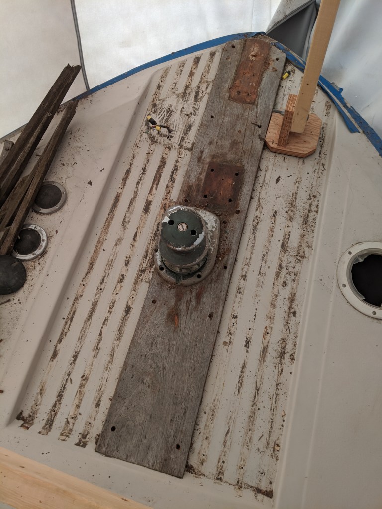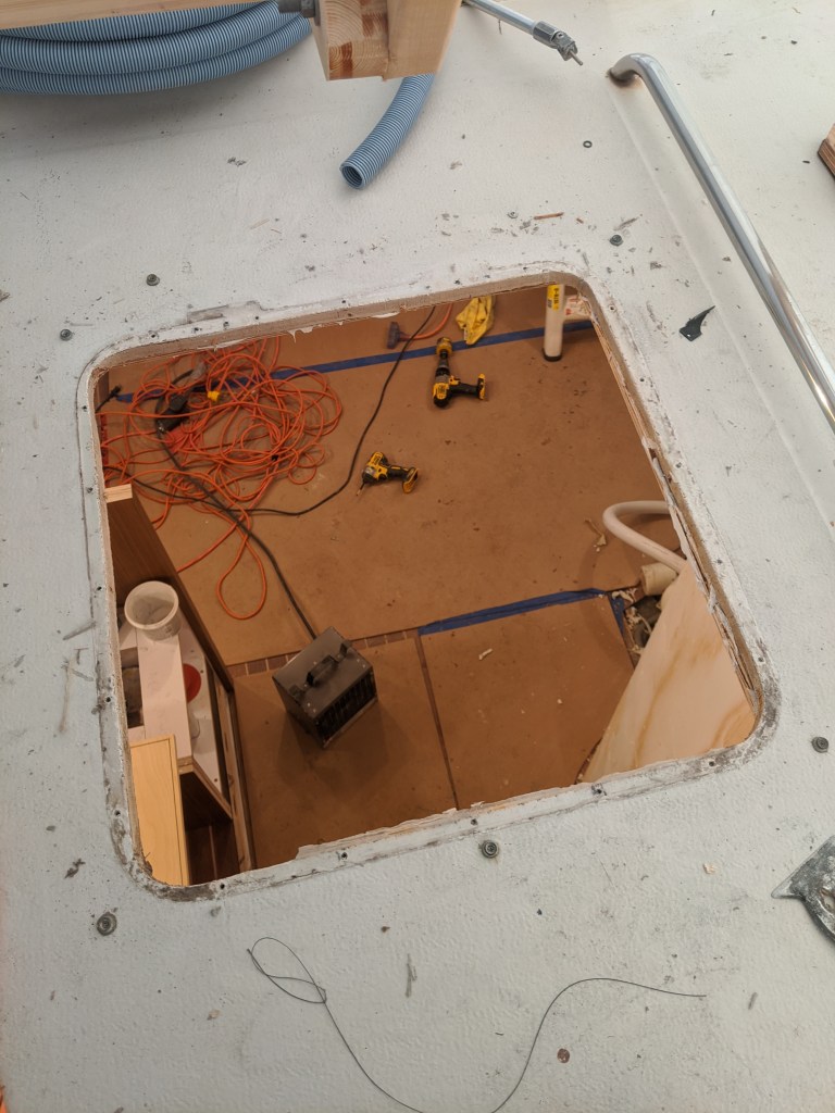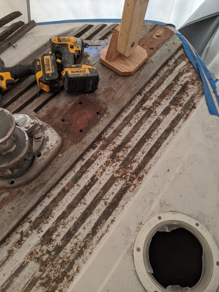 It was a very cold and sunny day so the temperature on the bow was perfect to work on removing the teak from the windlass area.