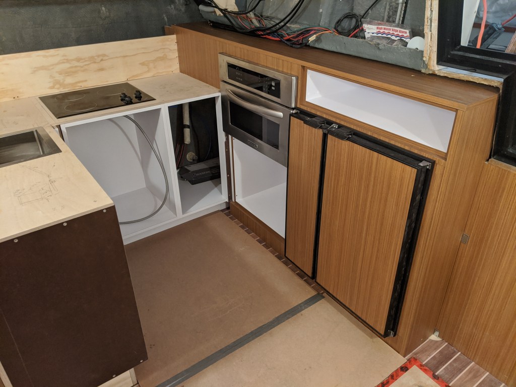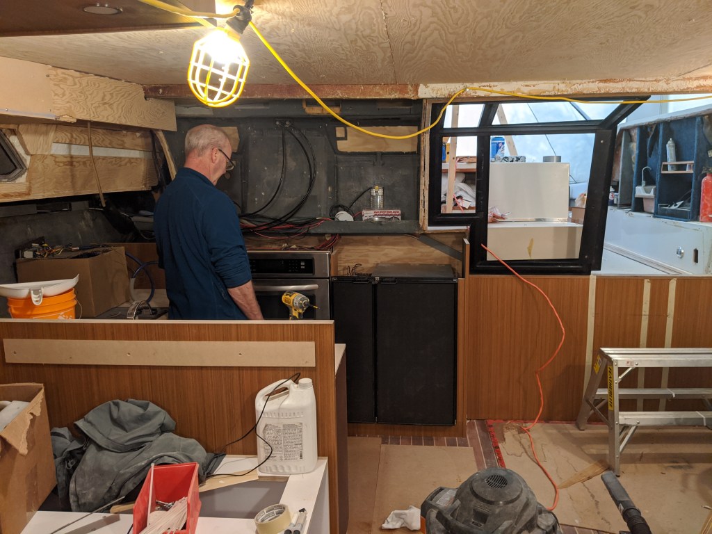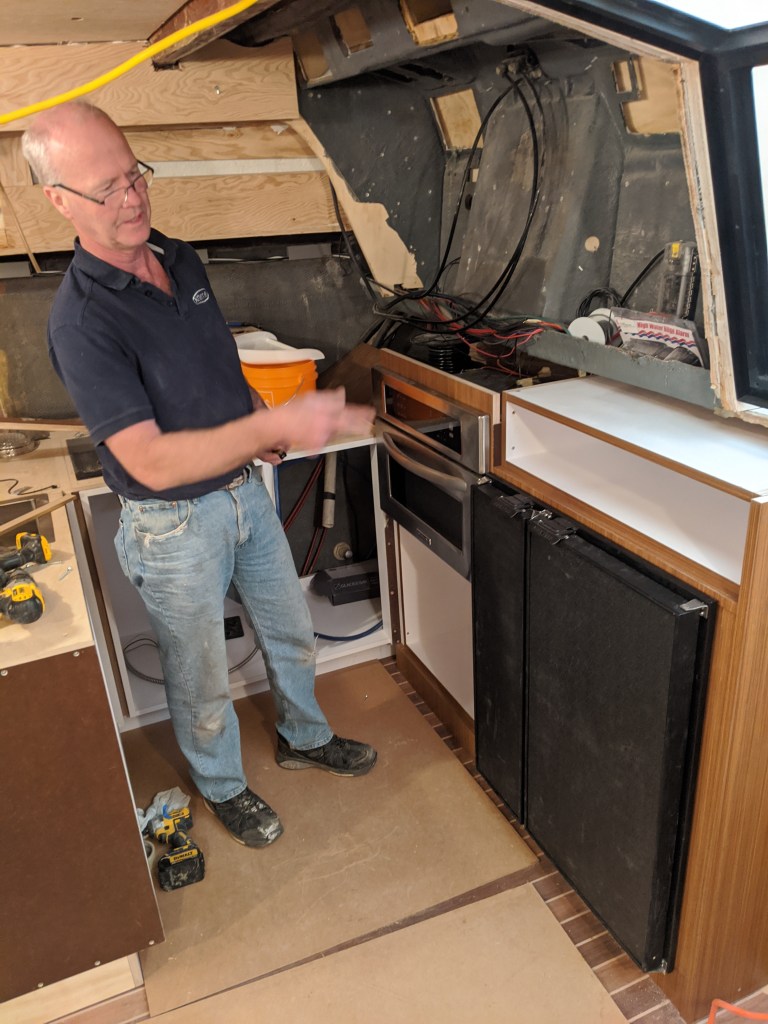 Donald’s main focus was the galley. Figuring out the final placement of the fridge took a bit of work. We will still need to be able to take the fridge out to get to the access panel underneath it.