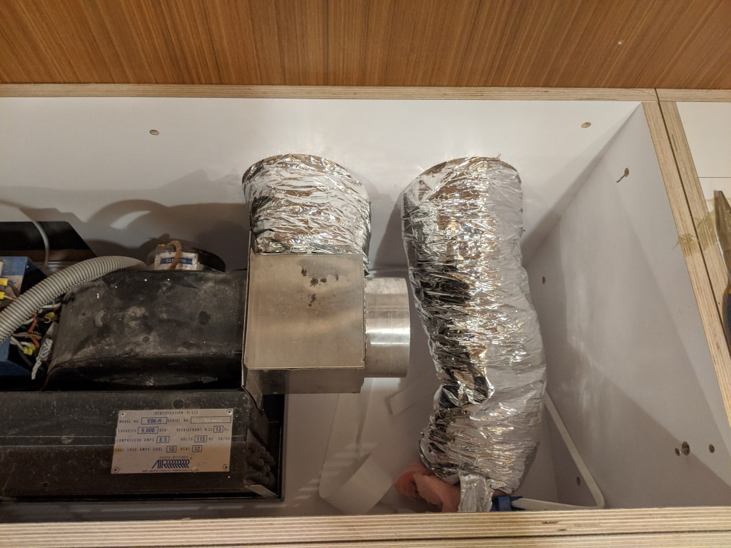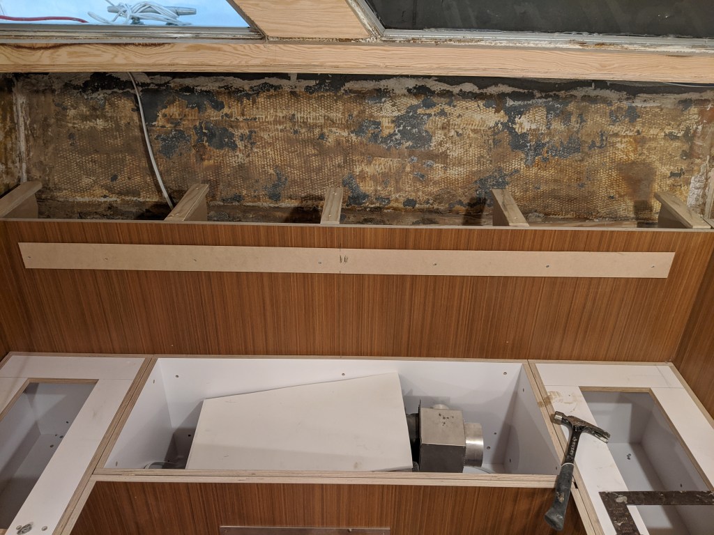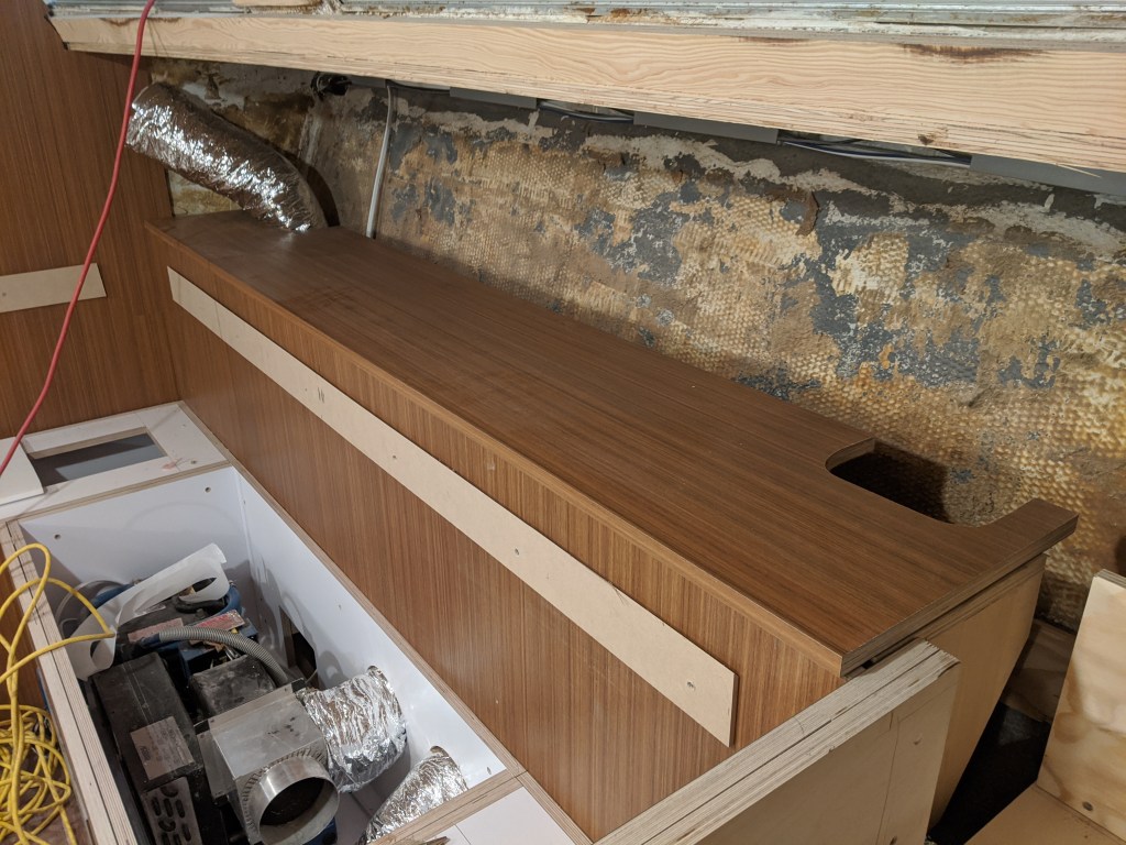 We did a bit of work on the air-conditioner in the sit down eating area and fitted a top shelf on the back of the seats. There will eventually be cabinets sitting between this shelf and the bulkhead above. There isn’t much more of the exposed fiberglass hull left now. Definitely won’t miss it.