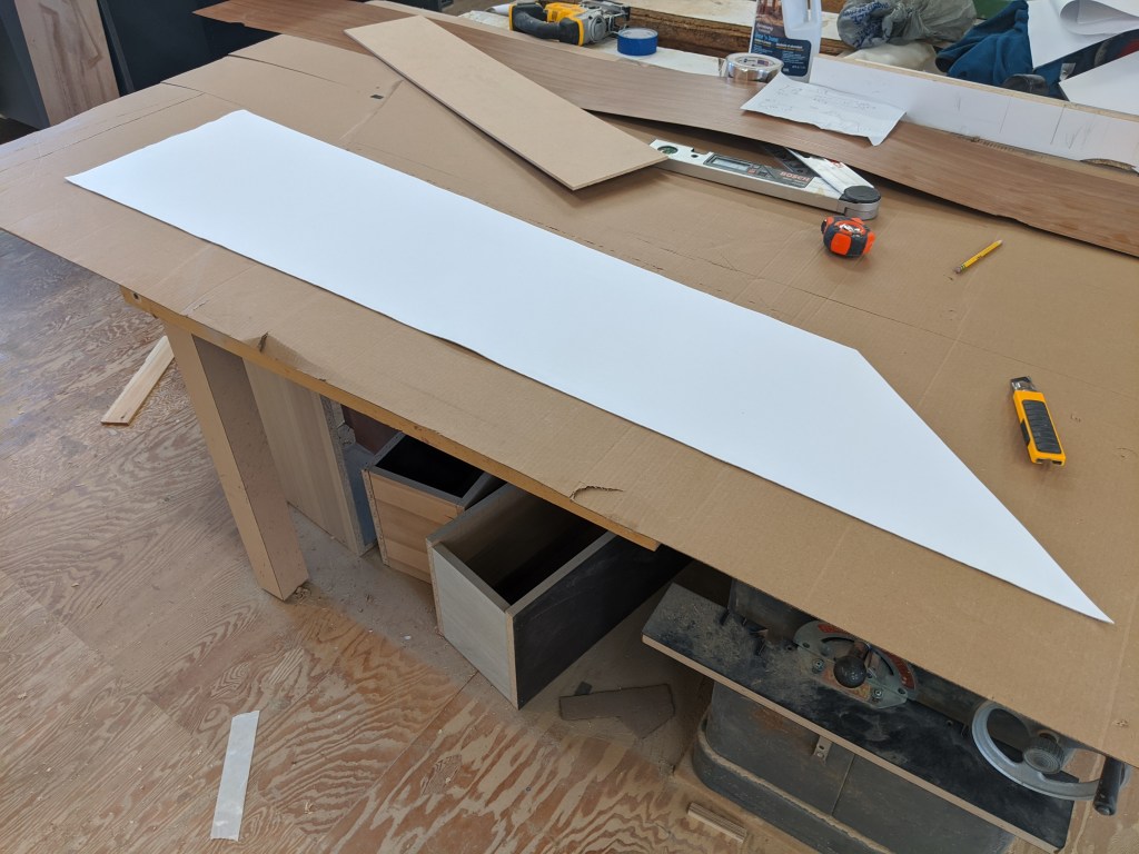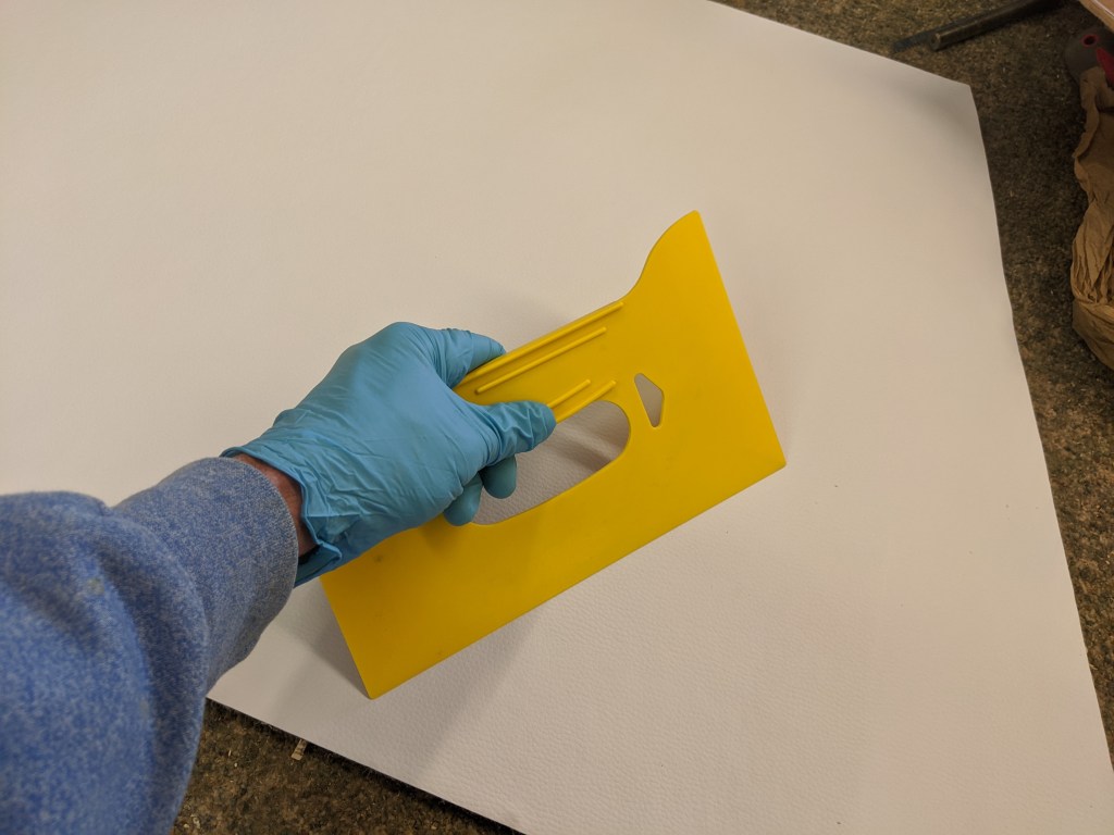 For the middle angled section we chose to apply it to a fitted panel so that there will be a slight reveal on both vertical edges. This way we could guarantee that it will be a straight line. I used a plastic trowel to smooth it out after I glued it on the the 1/4″ substrate. I learned that the vinyl will show finger pressure spots…and definitely wear gloves. The vinyl is washable but it is amazing how anything shows up on it.