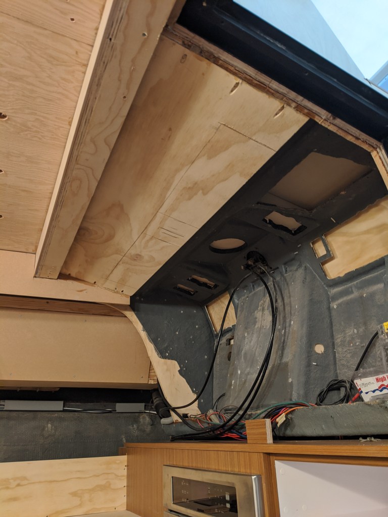 He decided to build up the inner “structure” with plywood and overlay the finished panels. We weren’t too concerned about losing headroom as the ceilings are pretty high here.