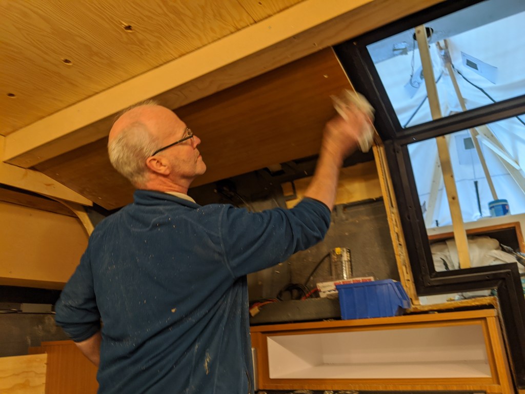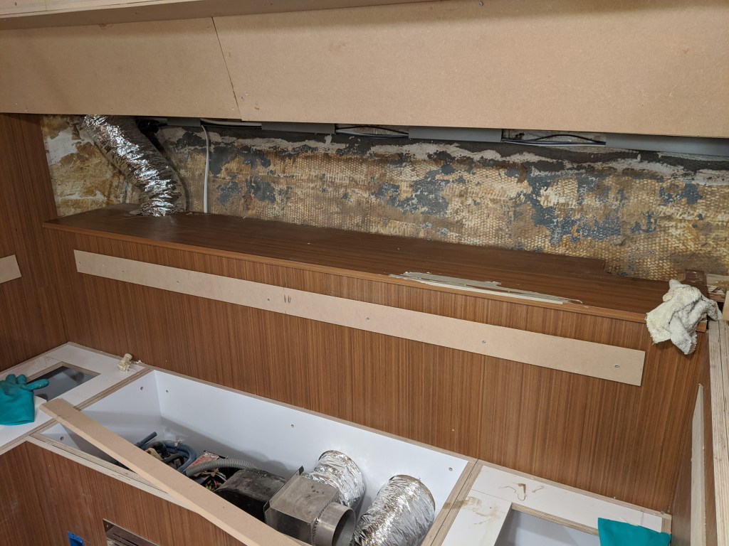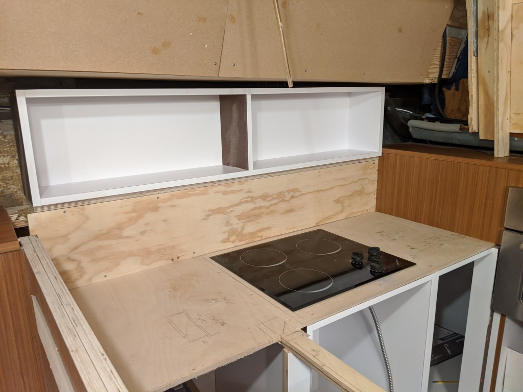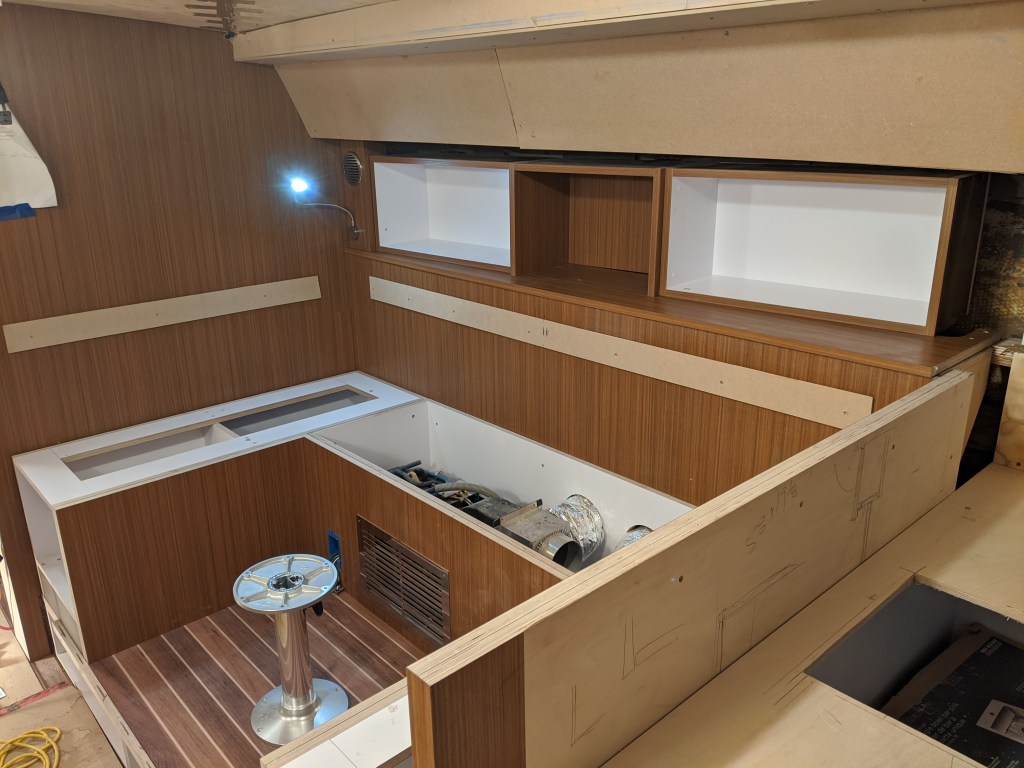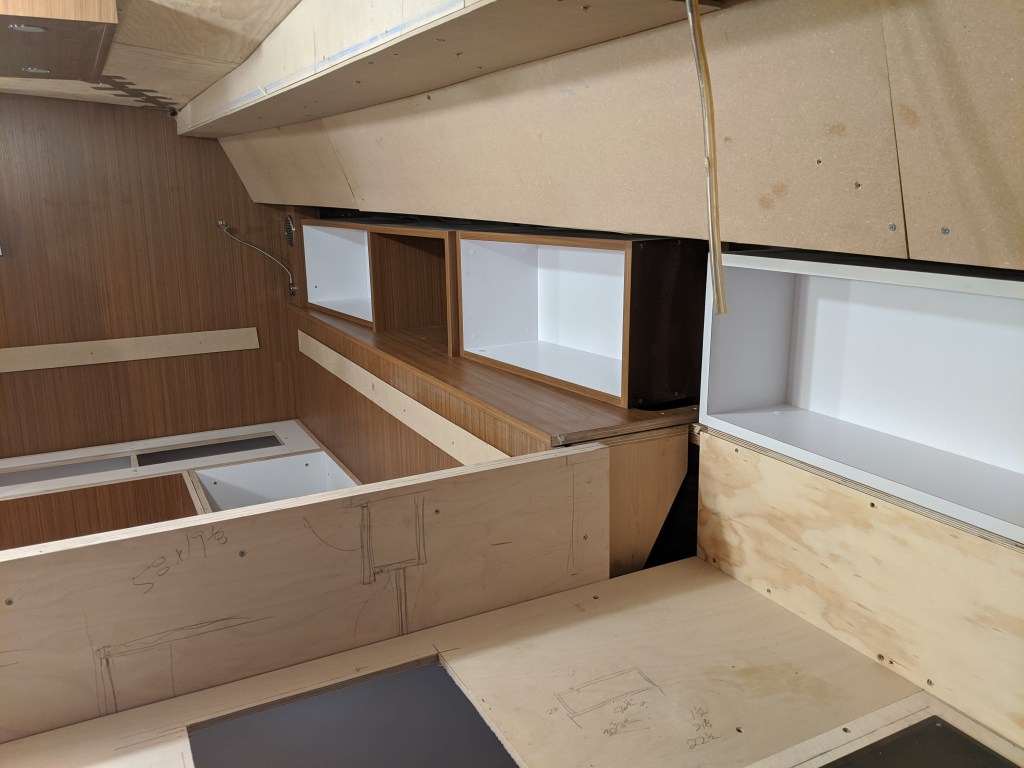 He then built the cabinets for the galley wall. These will have white doors and will also open by lifting up with flap stays.