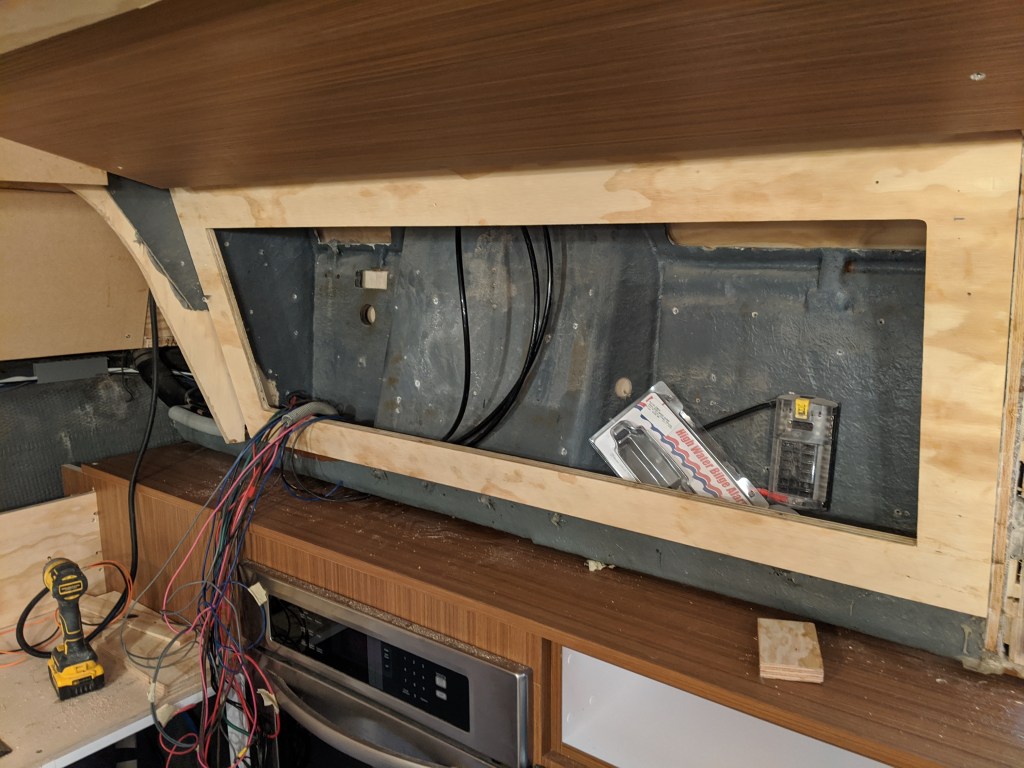 Donald took on the task that I hadn’t been looking forward to. This was because we really didn’t have an idea of what we were going to do. The removable panel(s) in the galley where we had to have access to the wiring in the helm was definitely something that had to be figured out as we went along.