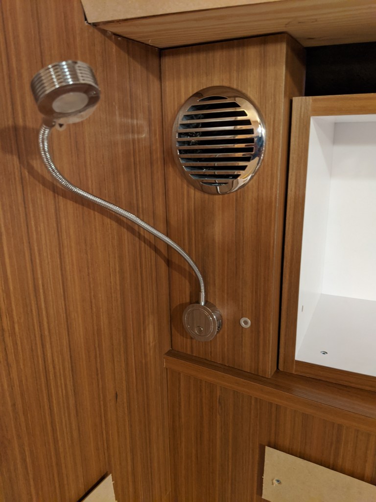 We then added the filler on the left which we made 6″ wide to allow for an air conditioning vent. I also wanted to add a reading light as well for when someone is sleeping in here and wanted to read at night. The small circle that is just to the right of the light is the touch dimmer switch for the four lights over the table.