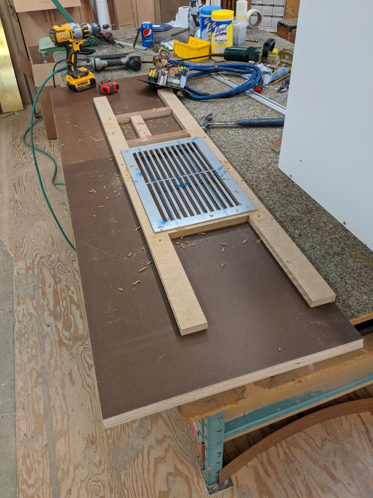 We had enough material for Donald to make up the panels for the face of this cabinet. Here he is laying out the cutouts for the air-conditioning vent and control panel. He does it this way so it can be cutout on the overhead router. He could have just used a jigsaw but this is Donald we are talking about. Even these cutouts…which will never be seen… have to look good. This is also why he is the one making the cabinets and not me.