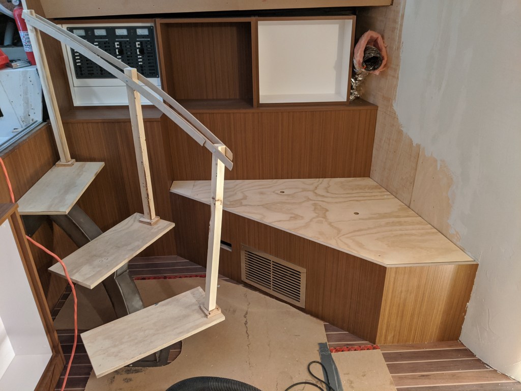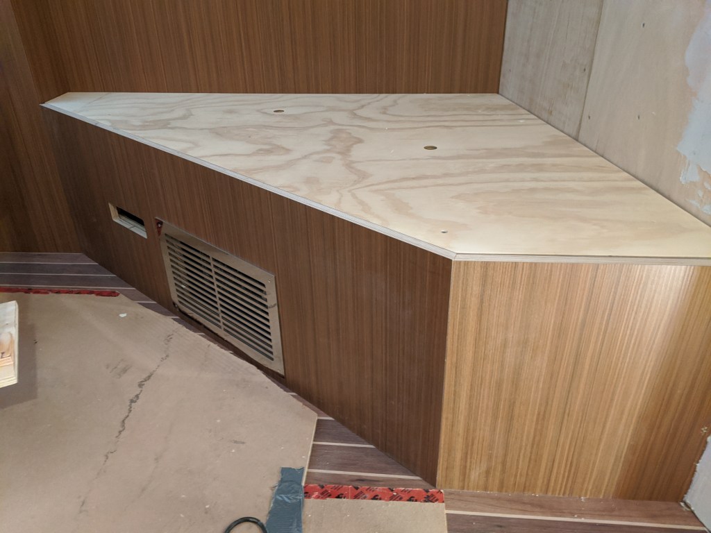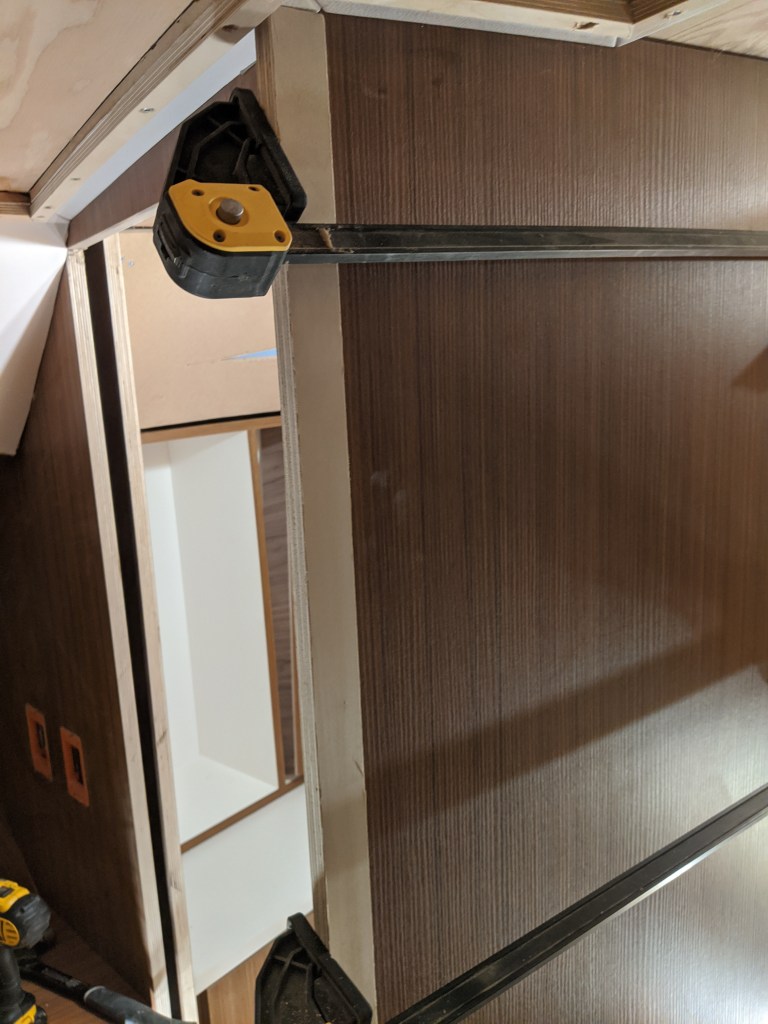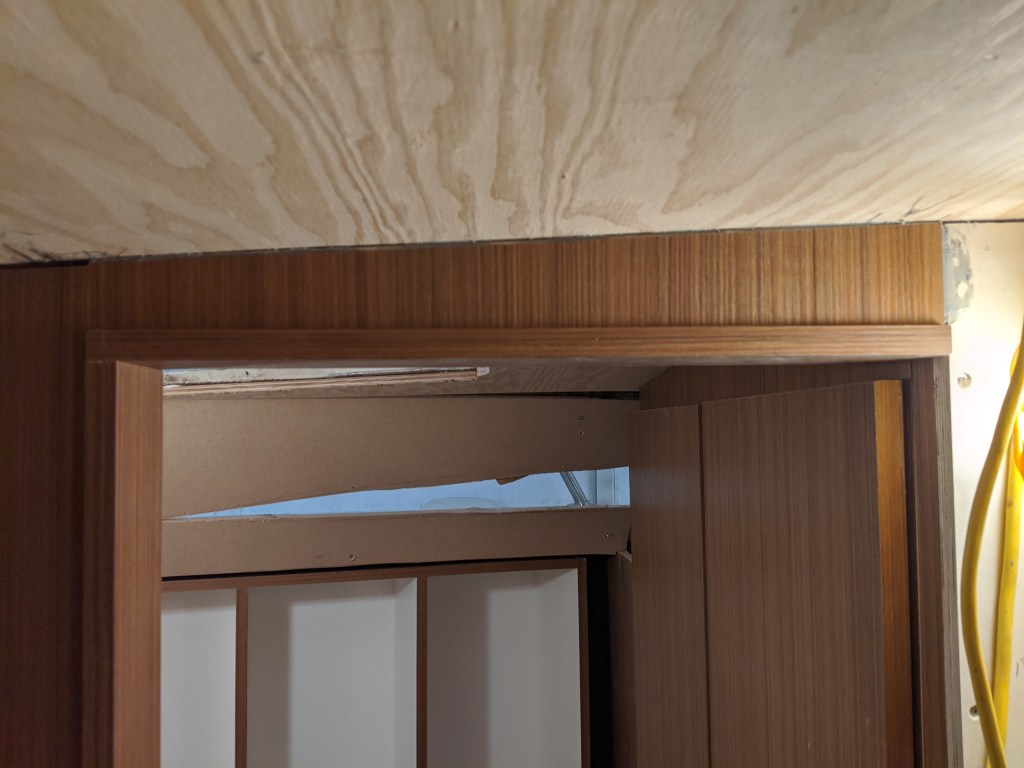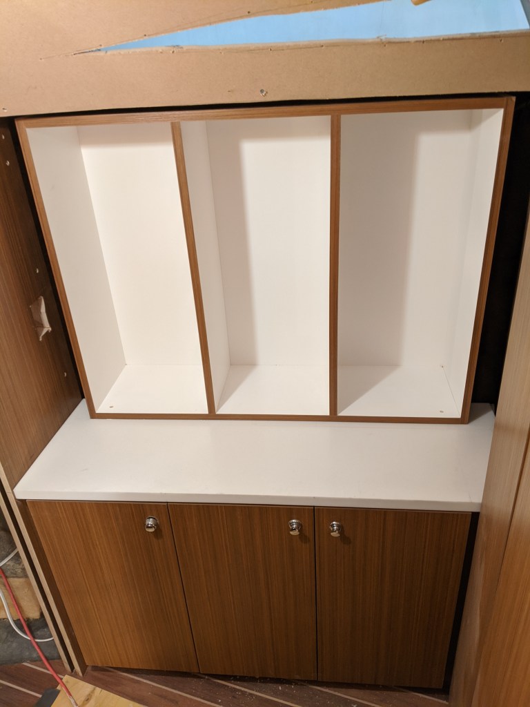 Donald also made the upper cabinet for the vestibule. This is another storage area that we aren’t entirely sure what we are going to use it for. This cabinet can’t be permanently installed until I have all the wiring done since most of it passes in behind it.