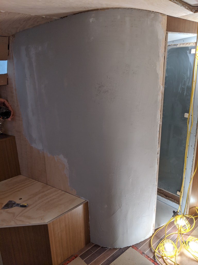 I also applied another coat of Durabond 90 to the curved wall. One more coat should have it nice and smooth. Once this is done I will prime it and we can put that laminate panel on. We are hoping we can get to that in by the end of next week.
