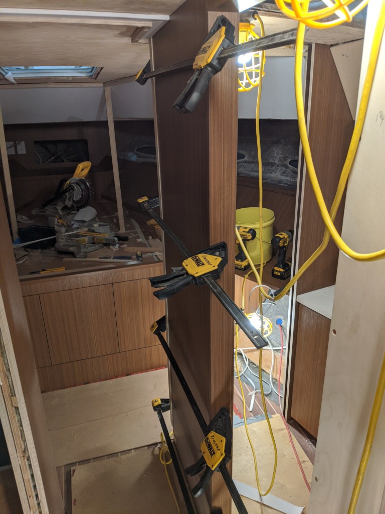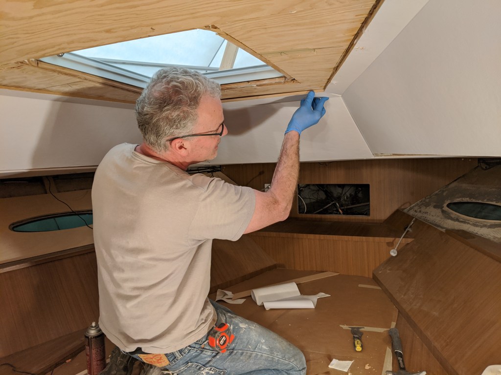 I continued my work on the headliner for the v-berth. The ceiling panels will be stepped down so that there is a recess for strip lighting. I’m not wearing gloves for health reasons. Although the vinyl is easy to clean I am using glue which isn’t as easy to clean.