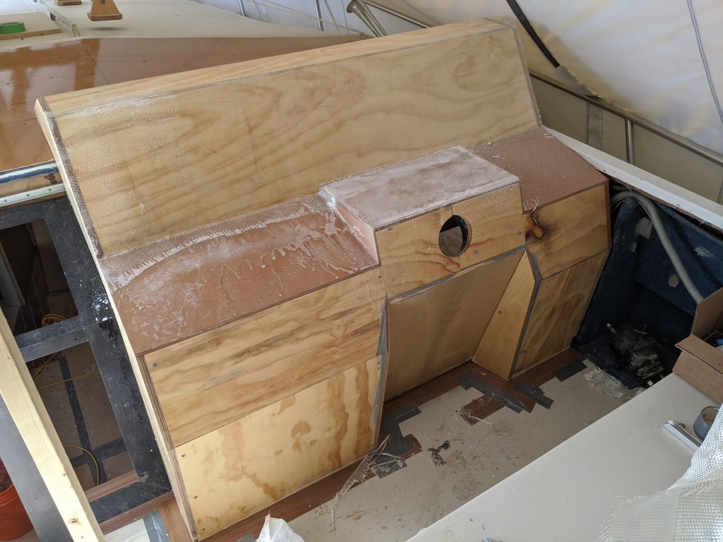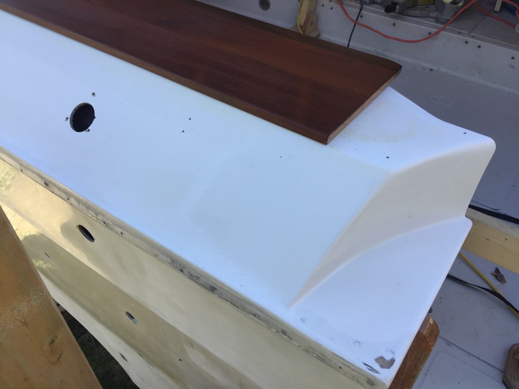 We wanted to simplify things and have a more consistent and cleaner look on the top of the transom. We also really didn’t feel we needed the little bit of storage that this area would give us. We have a plan for something in the back corner of the cockpit that we will be making in the fall.