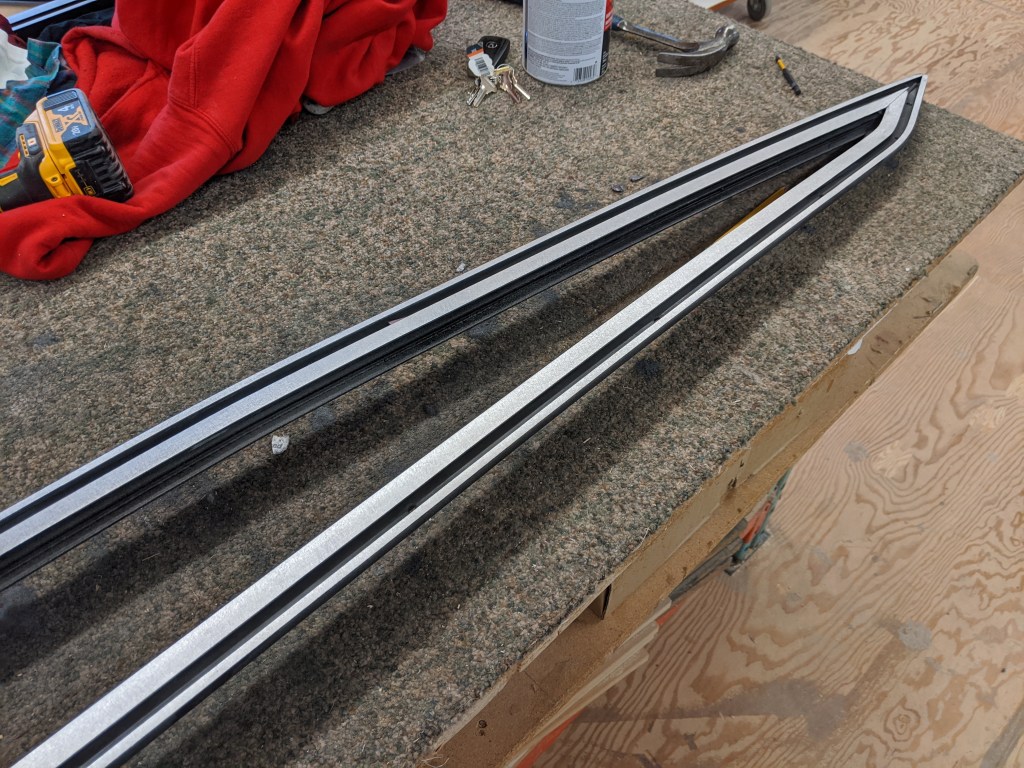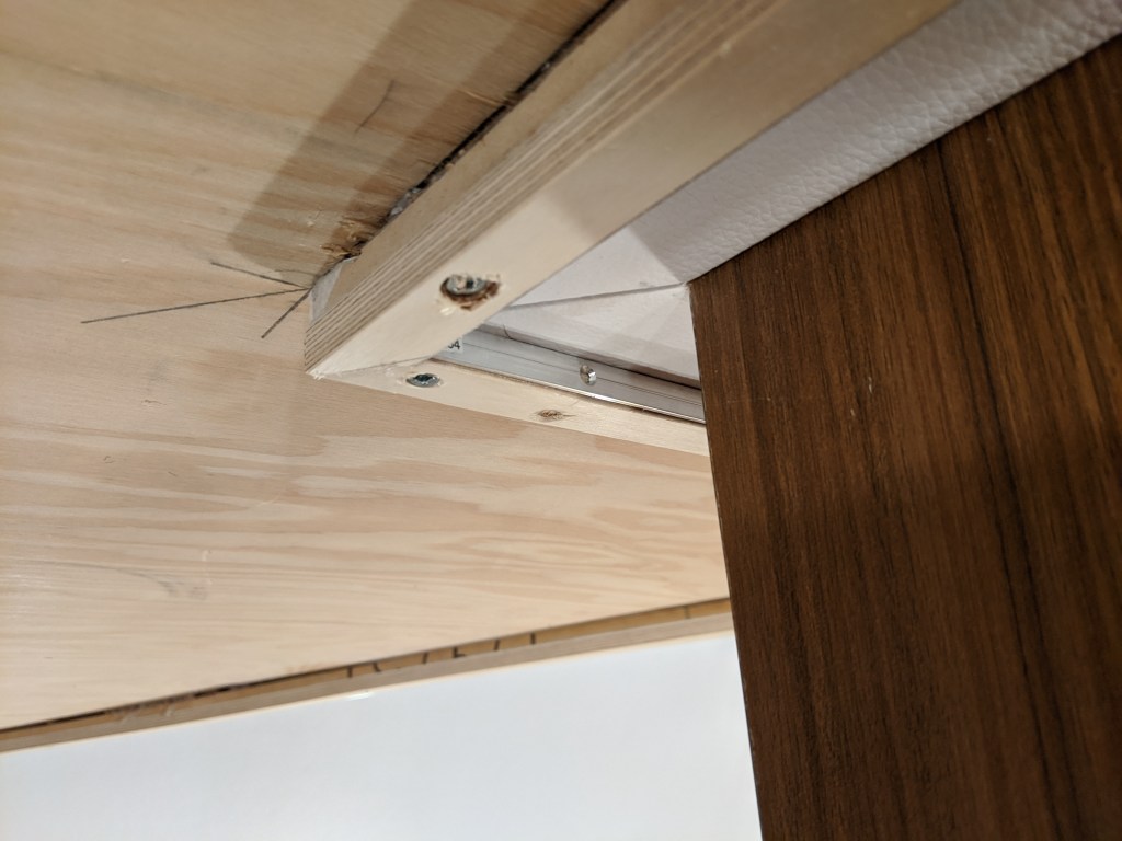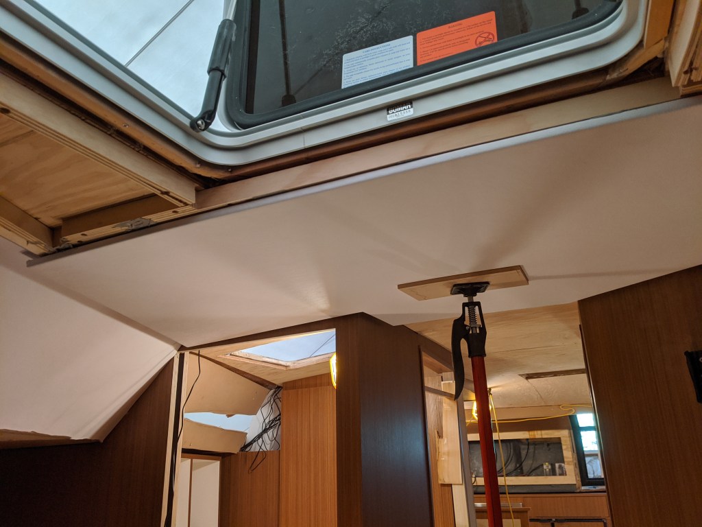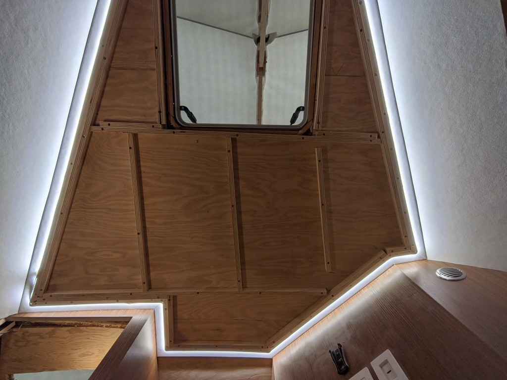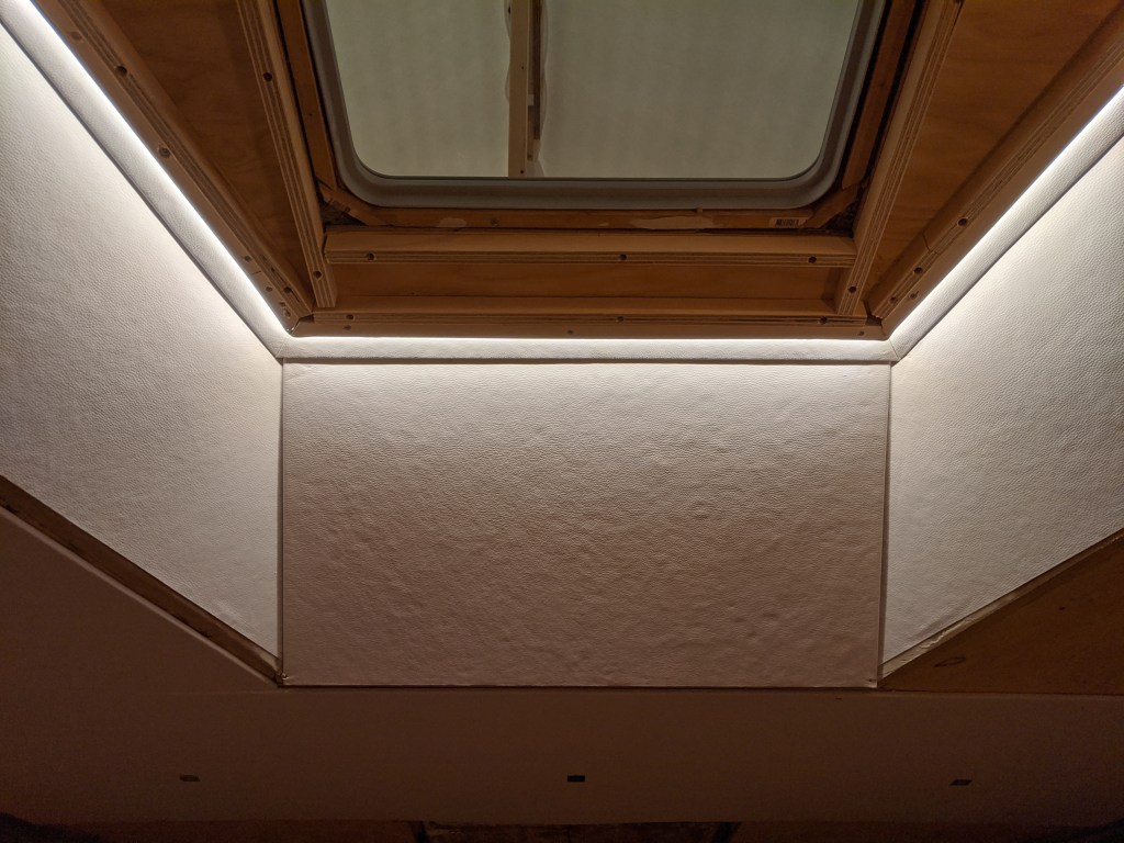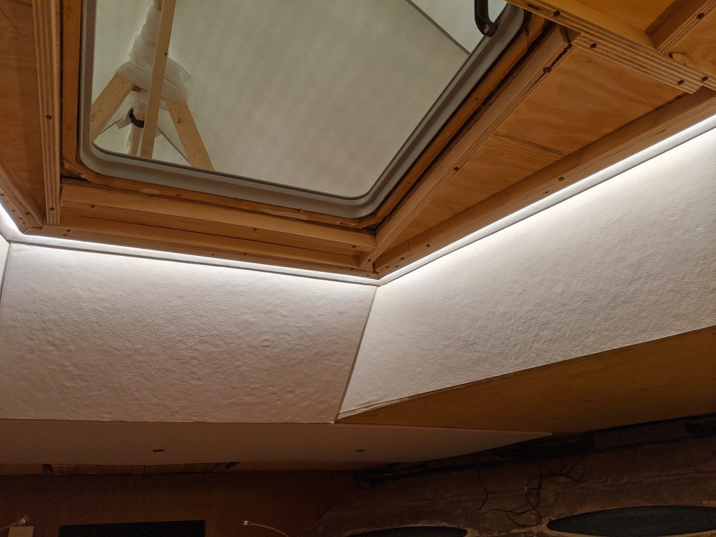I did more work on the headliner in the v-berth as well. I added in the LED strip lights that will be the main source of light for the area. This will be covered with a main panel that allows a 1″ reveal around the perimeter. First I had to install an aluminum strip that will help dissipate any heat that the lights give off… which isn’t much.