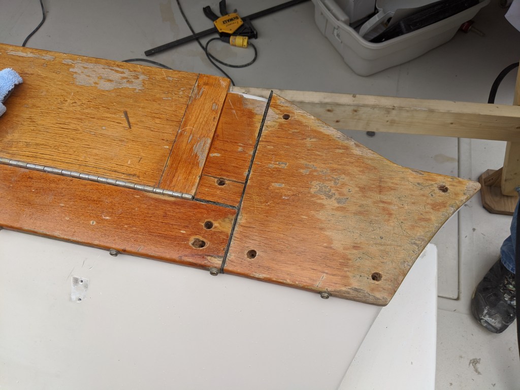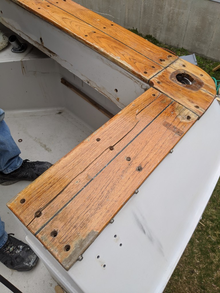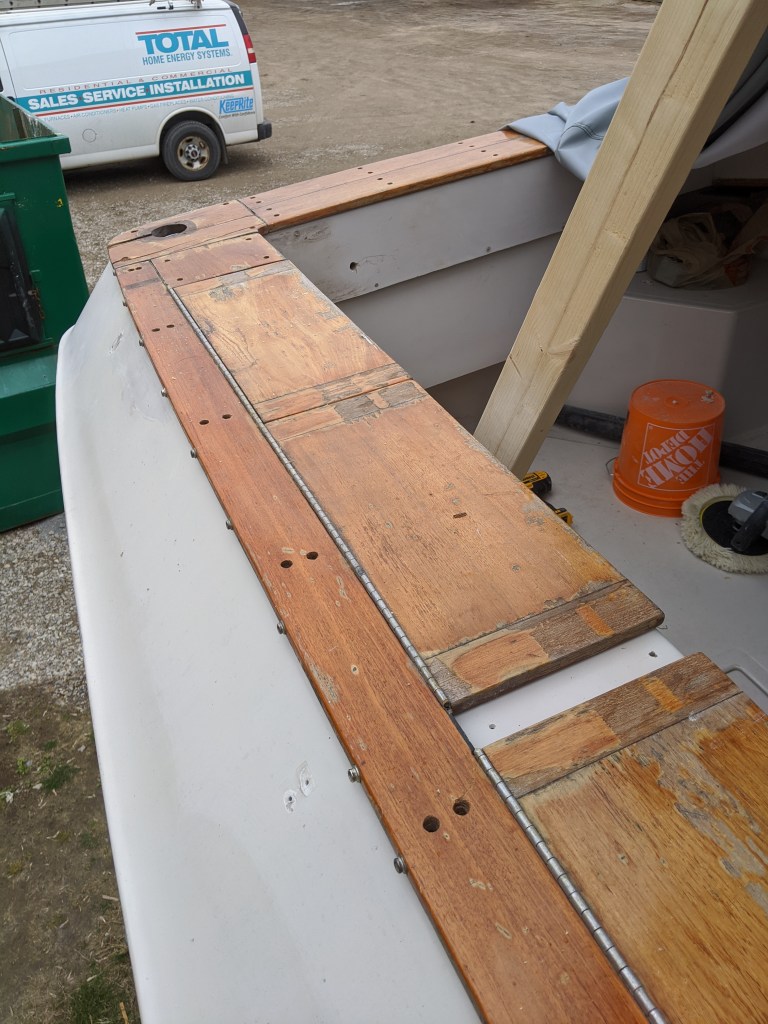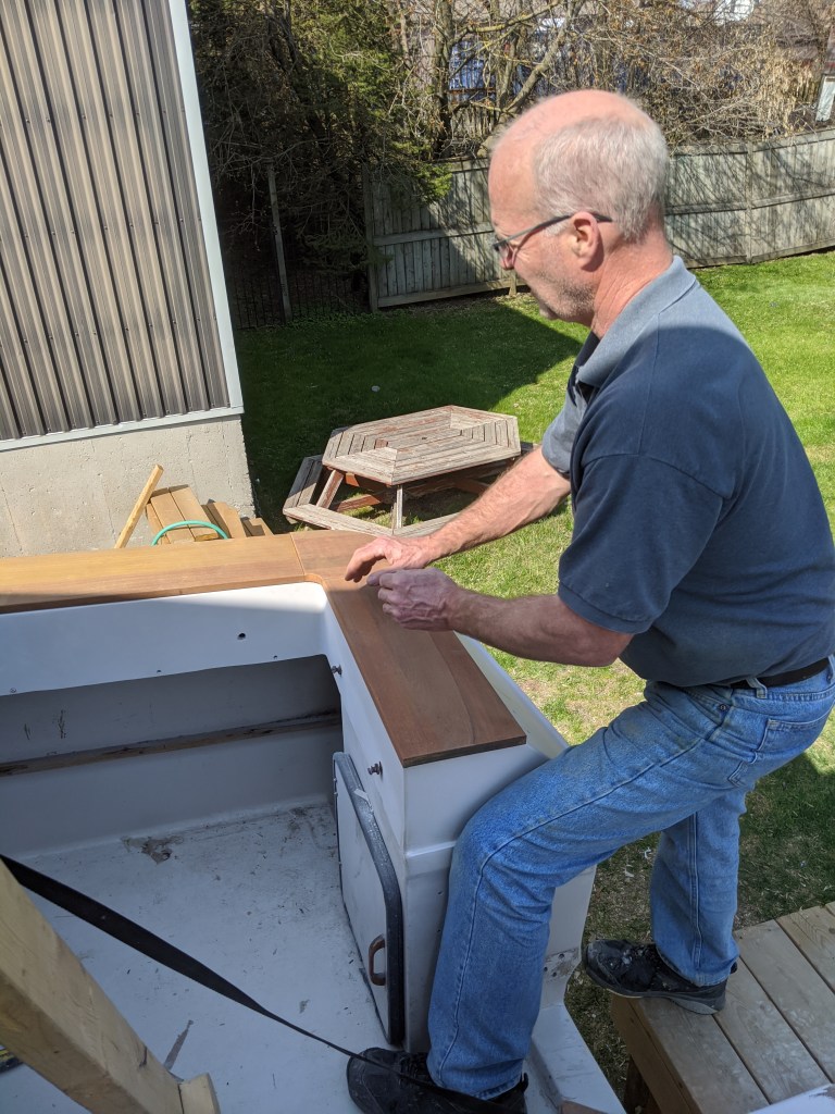 Donald wanted to do a bit of exterior work this week and, since the weather was so nice, he took on the job of cutting the new caps for the transom. The original wood (which we think was teak) was in pretty bad shape. They also accessed some storage from the top of the transom and so the cap was actually broken up into smaller pieces which were the flip up lids. Donald put them back together in place to make sure we still had all the pieces of this puzzle.