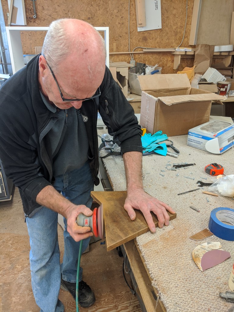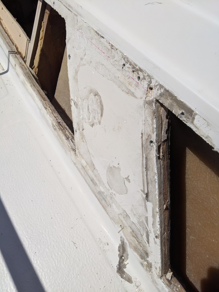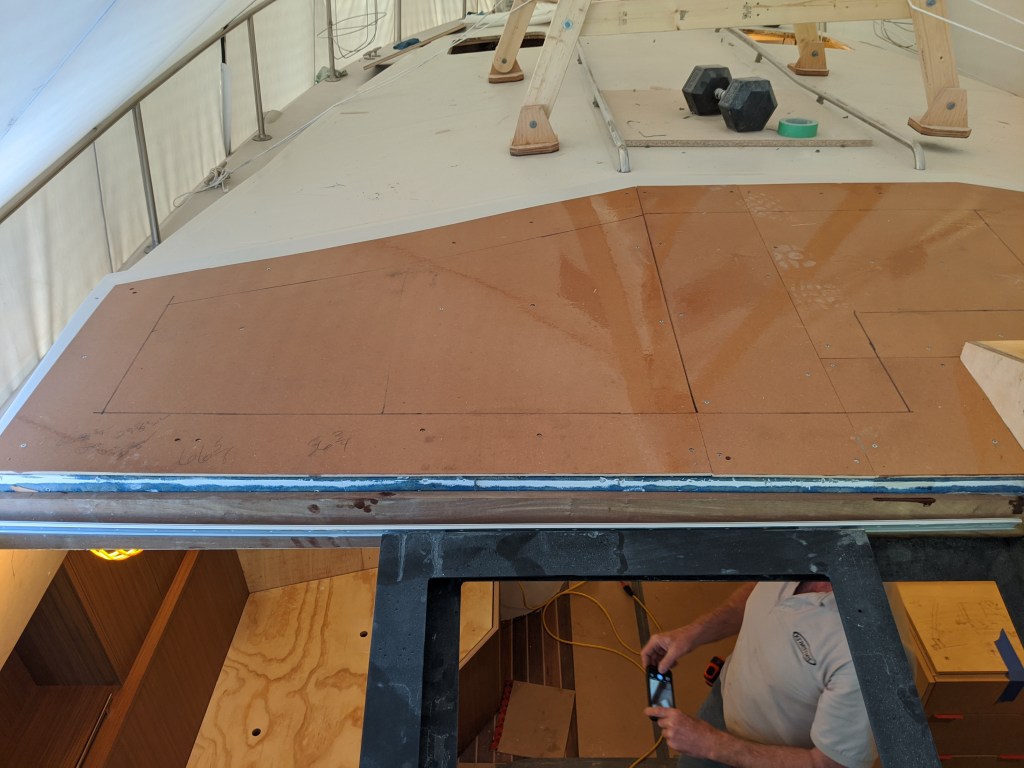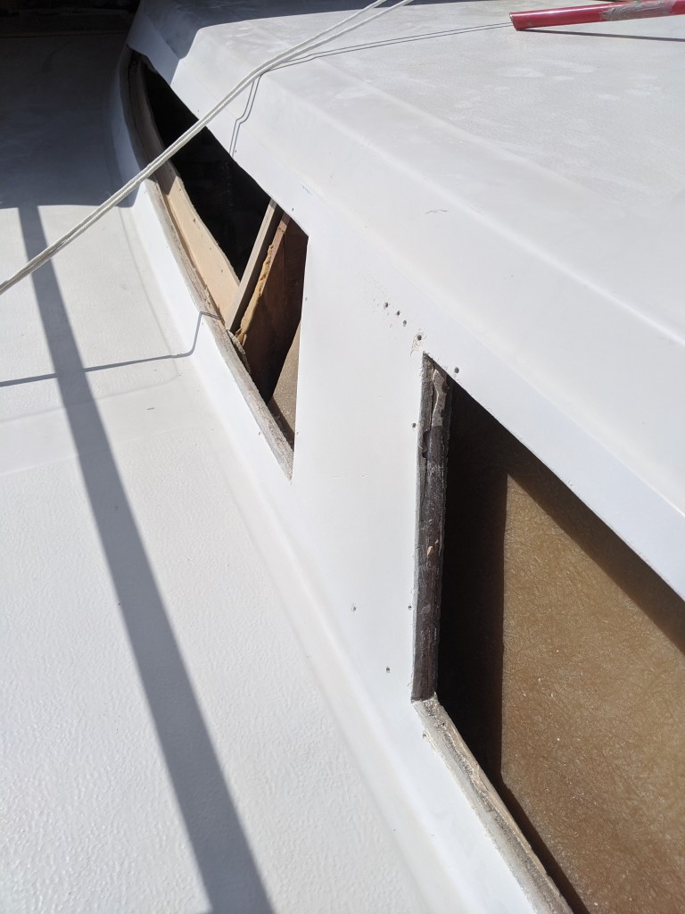 Donald wanted to do a bit of exterior work this week and, since the weather was so nice, he took on the job of cutting the new caps for the transom. The original wood (which we think was teak) was in pretty bad shape. They also accessed some storage from the top of the transom and so the cap was actually broken up into smaller pieces which were the flip up lids. Donald put them back together in place to make sure we still had all the pieces of this puzzle.