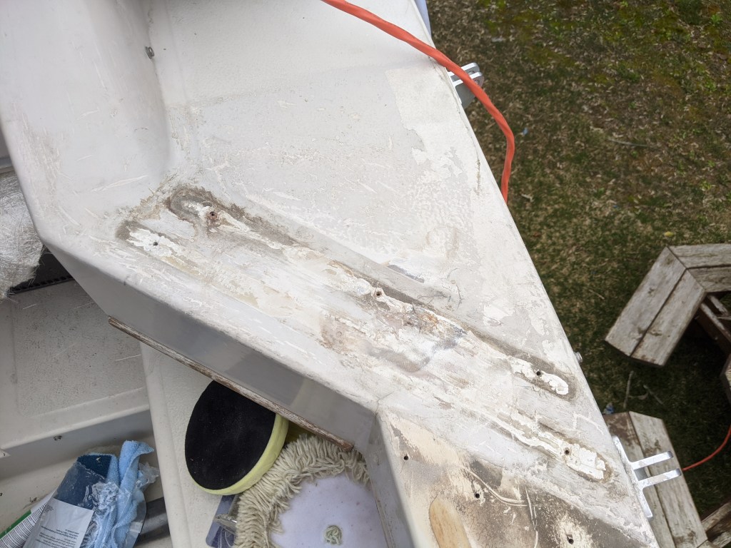 I sanded the gel-coat down to a matt finish using 80 grit and then 120 grit. The next step is to sand it with 400… and then 1000 and finally 1500. This will get it to a fairly nice shine but then we buff and polish it. It is amazing how much cleaner it looks just with the rough sanding.