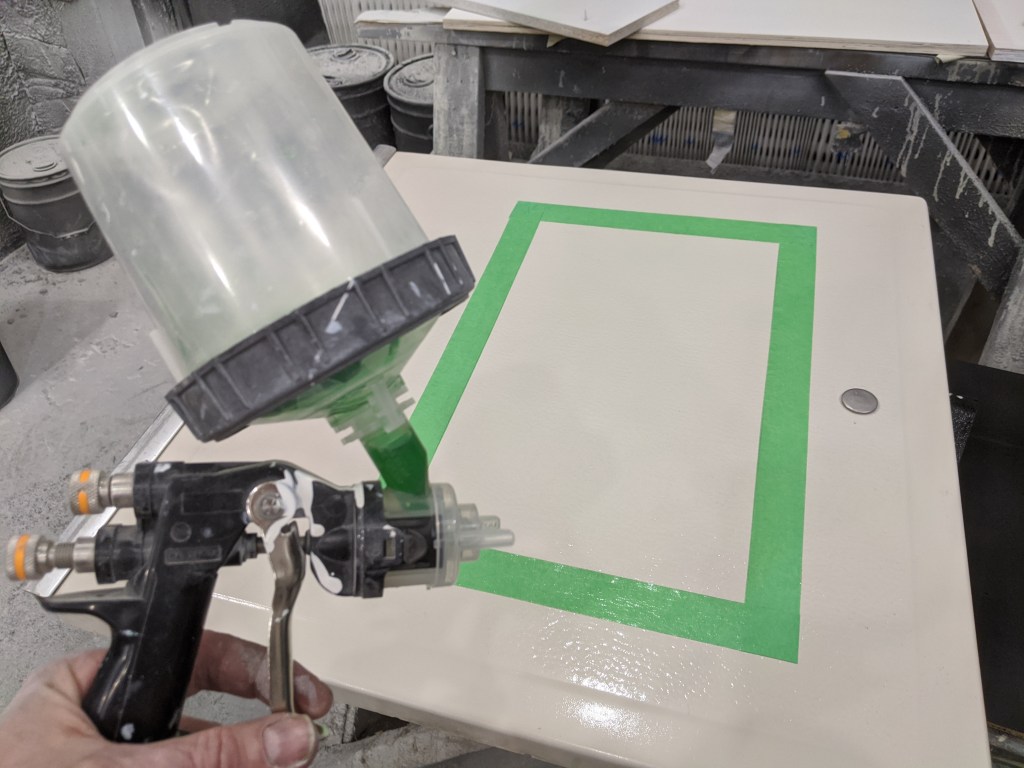 In order to stop the gel-coat from sticking to the surface I sprayed on several layers of PVA mould release using a spray gun. It creates a thin film which the gel-coat won’t stick to.