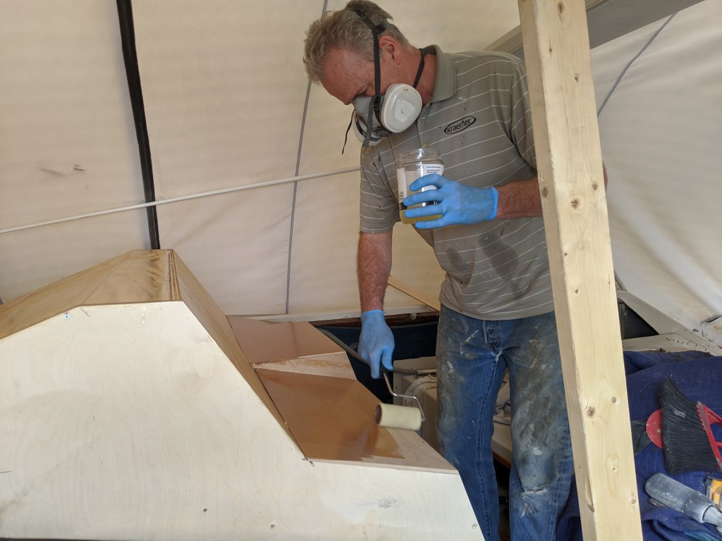 Earlier this week I started to prep the helm for fiberglass by applying a first coat of resin to the plywood.