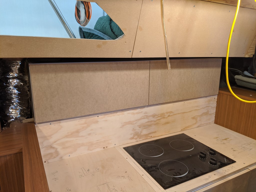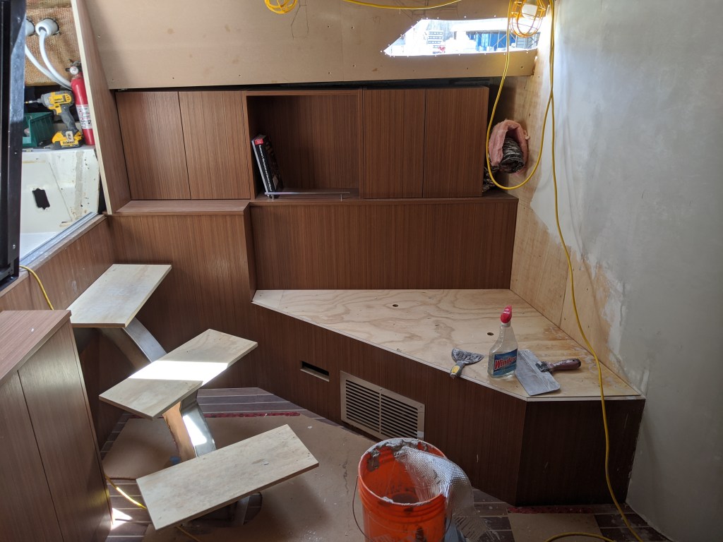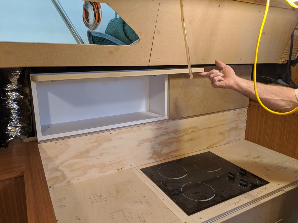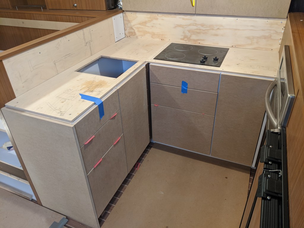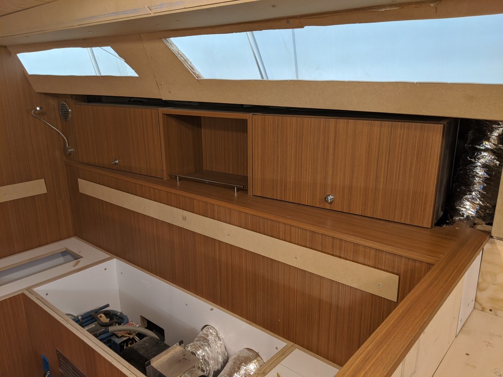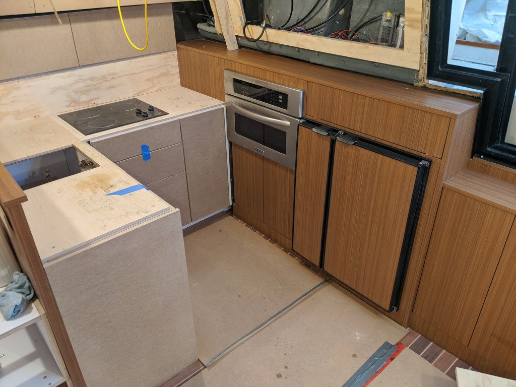 The doors and drawer fronts for the galley are going to be a painted white. The finish will have a very durable clear coat with a soft sheen. Donald made up the doors and drawer fronts and put them in place for the photos. He will be working on the drawers over the next few weeks.