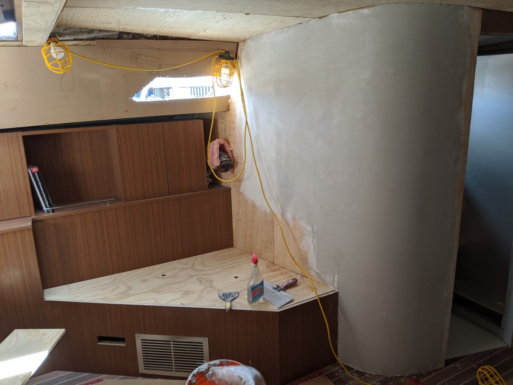 The final coat of Durabond was applied to the wall and now it is ready for priming. Once that is done we can cover it with laminate. That unfinished curved wall has been staring us in the face for so long (almost taunting us) and it will be a cause for celebration when it is done. Hoping to get to that this week.