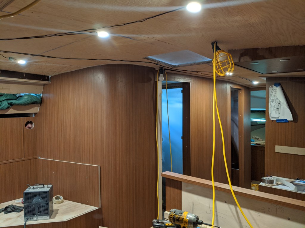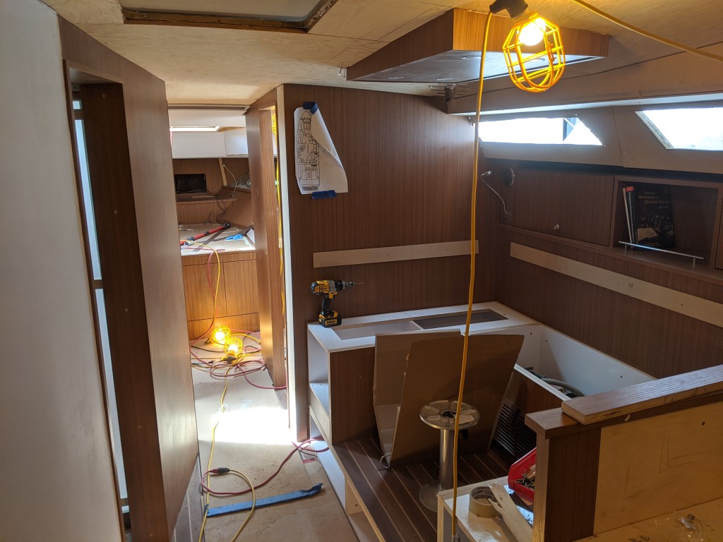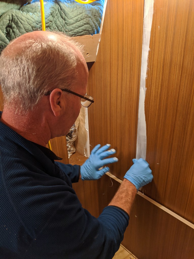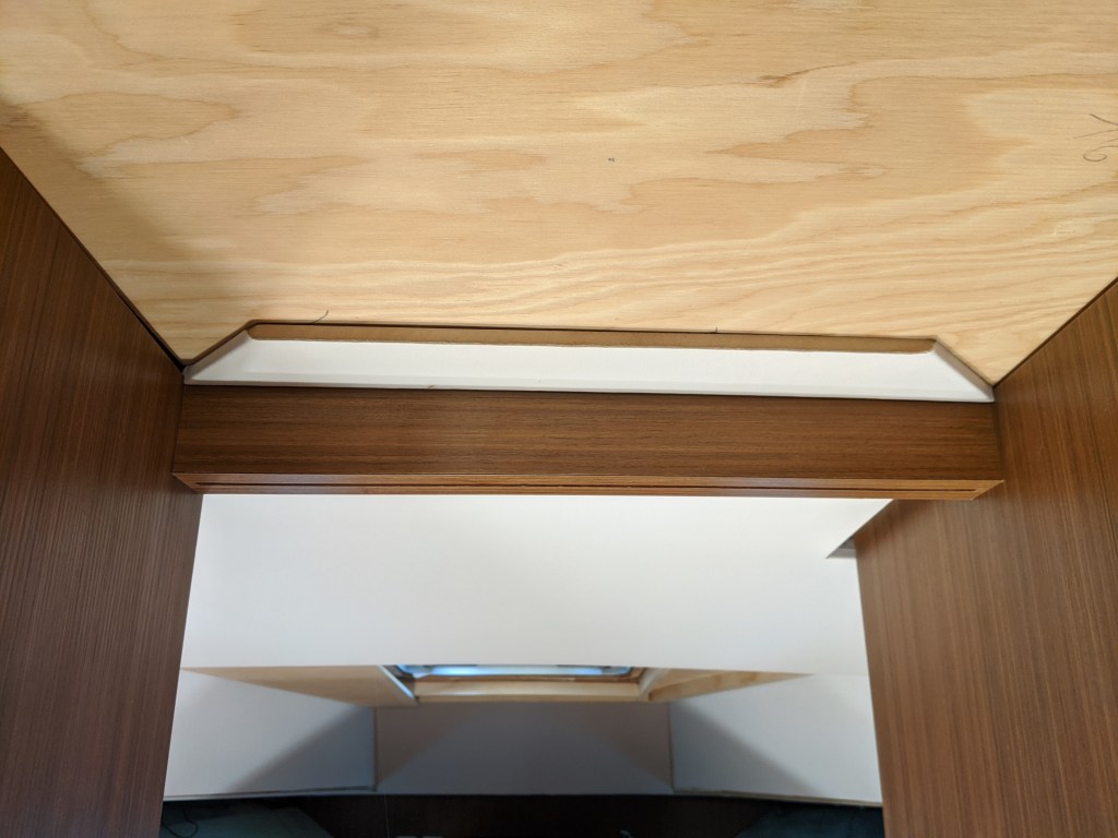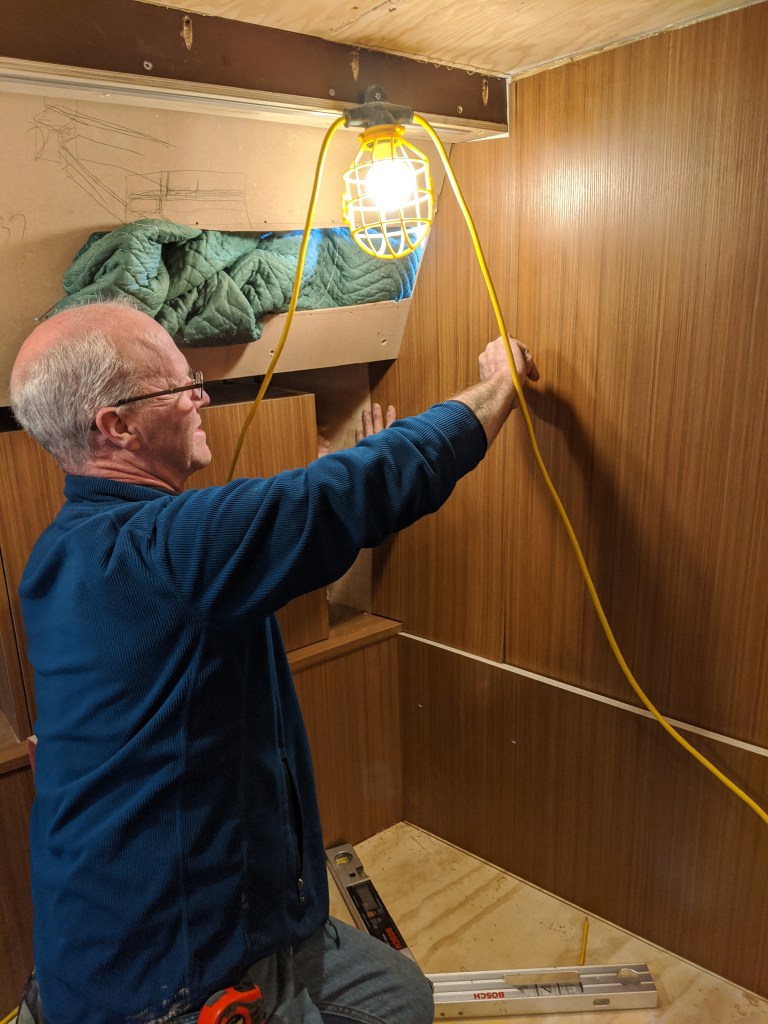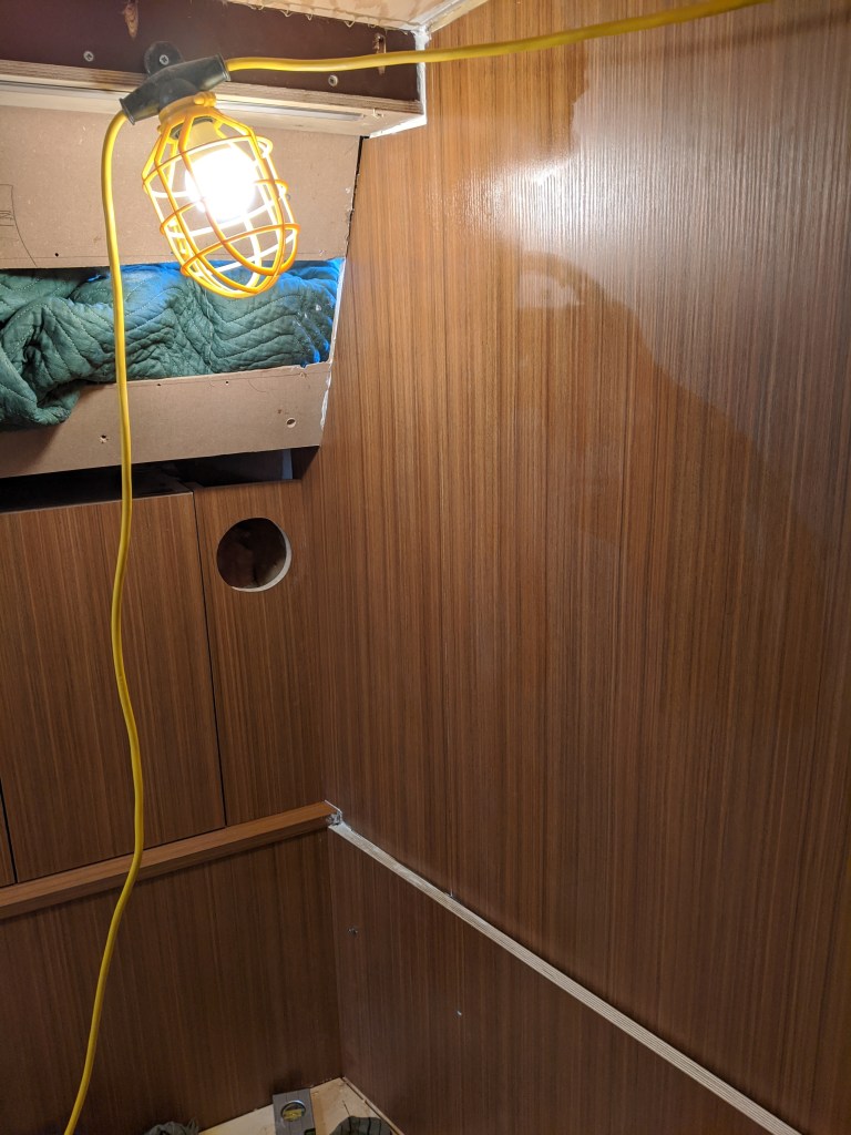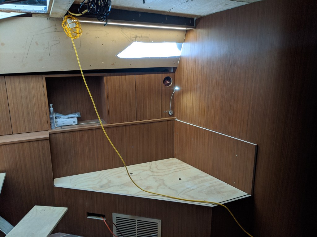 Donald put in a laminate covered bulkhead that the top edge of the glass will be inserted in to. This also covers the LED lights in the v-berth ceiling.