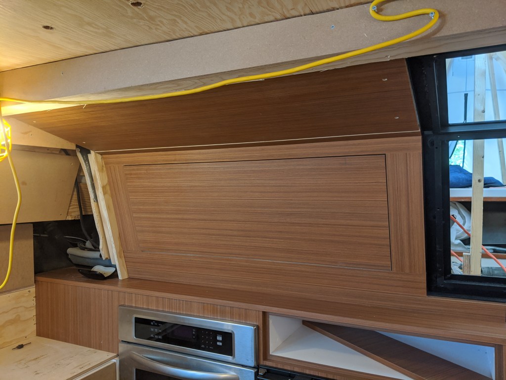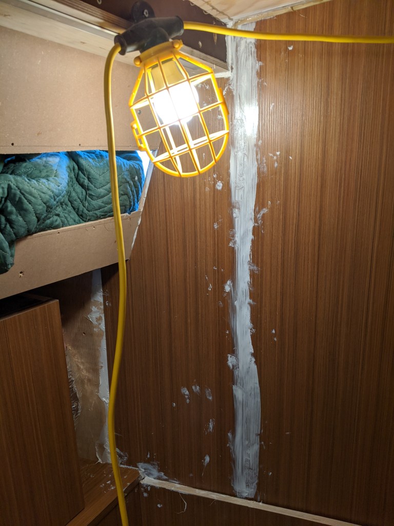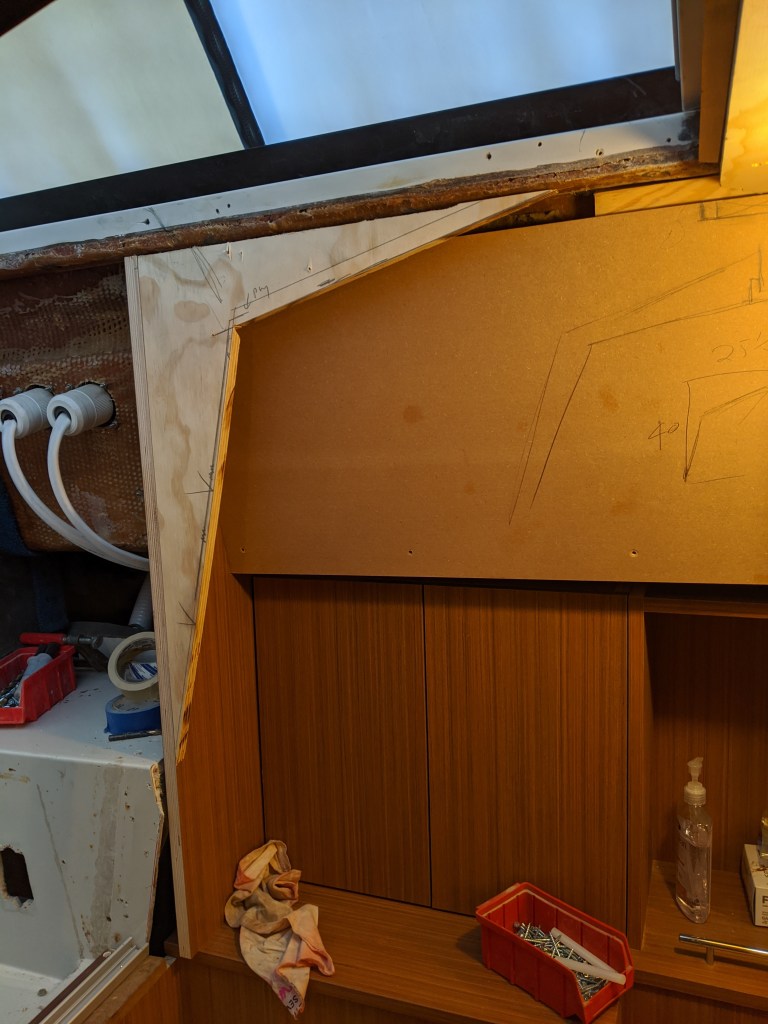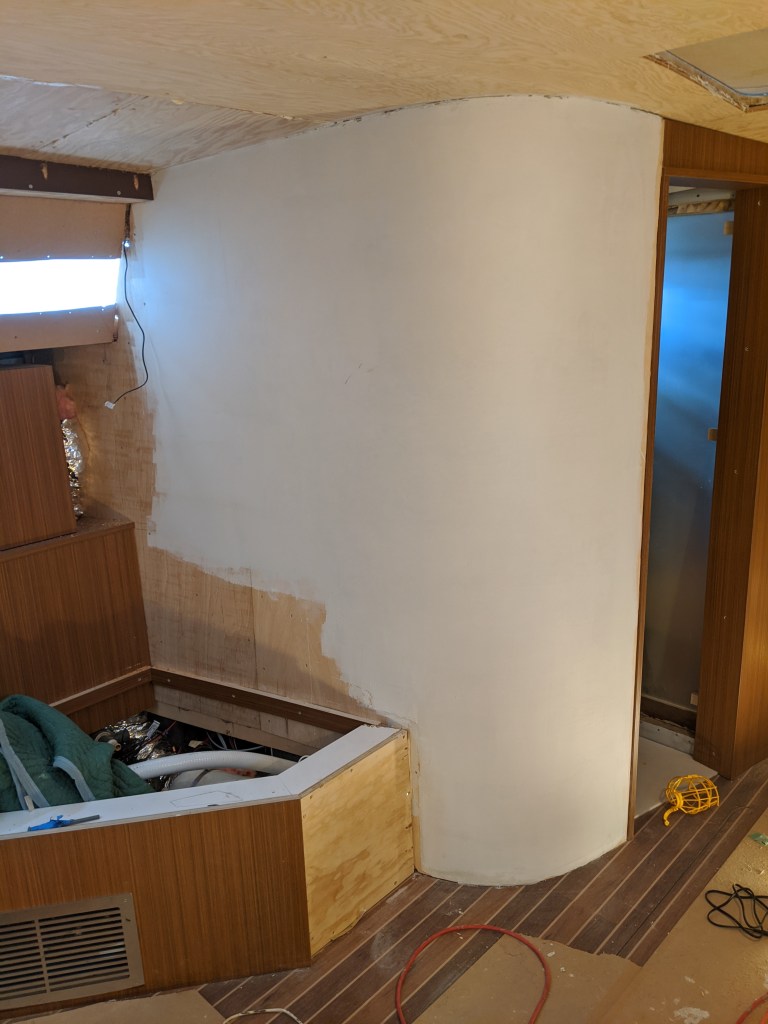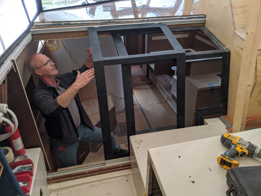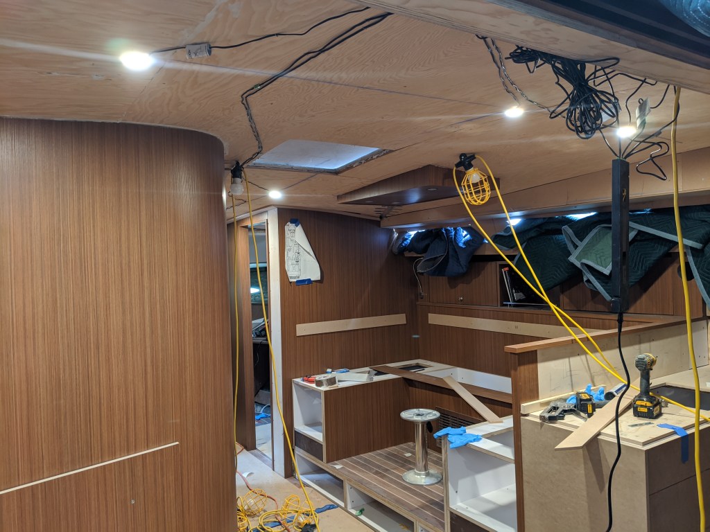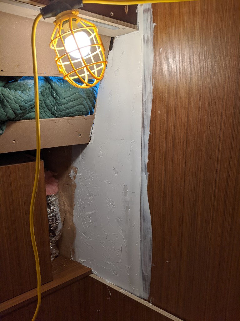 Donald put in a laminate covered bulkhead that the top edge of the glass will be inserted in to. This also covers the LED lights in the v-berth ceiling.