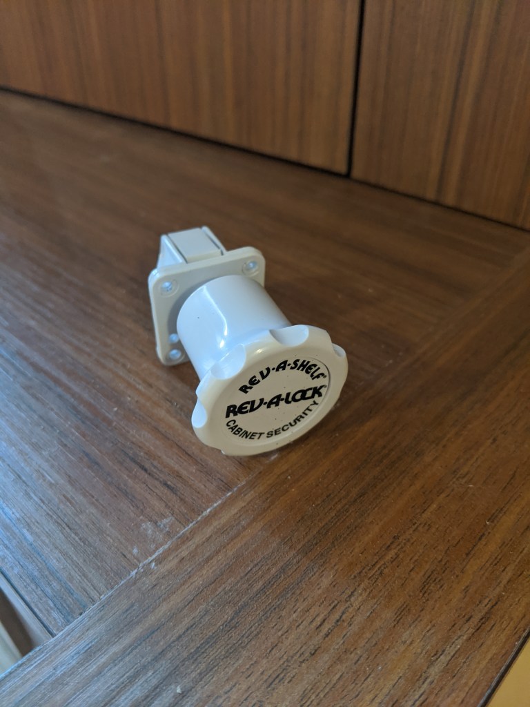 Donald also worked on the removable panel behind the helm. We wanted this to blend in as much as possible and didn’t want to see exposed fasteners. I found these magnetic locks on line and we figured two would hold the panel in place.
