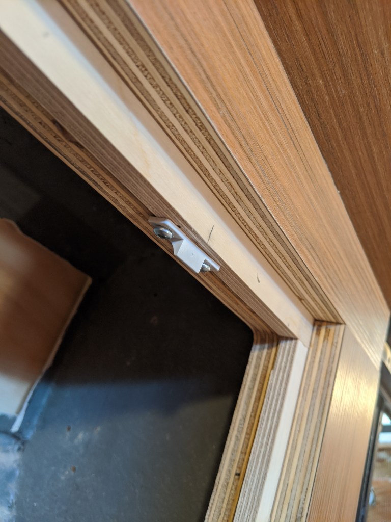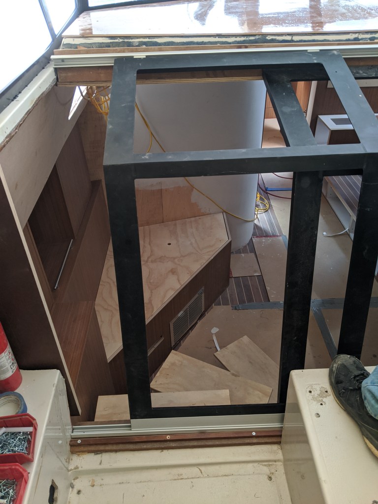 … and from the hallway in front of the mid-berth. I started putting in the perimeter edging to create the same stepped reveal as in the v-berth. The slot on the underside is where the glass will slip in to.