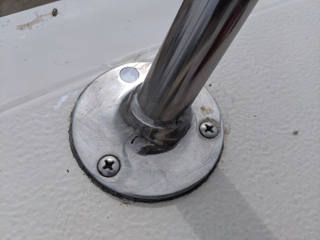 Another project that we added to the list was re-bedding the posts for the railings. Since we aren’t able to completely remove the railings, and we still have access so that we can remove the bolts from the bottom plates, we thought that we would take this opportunity to reseal the fasteners.