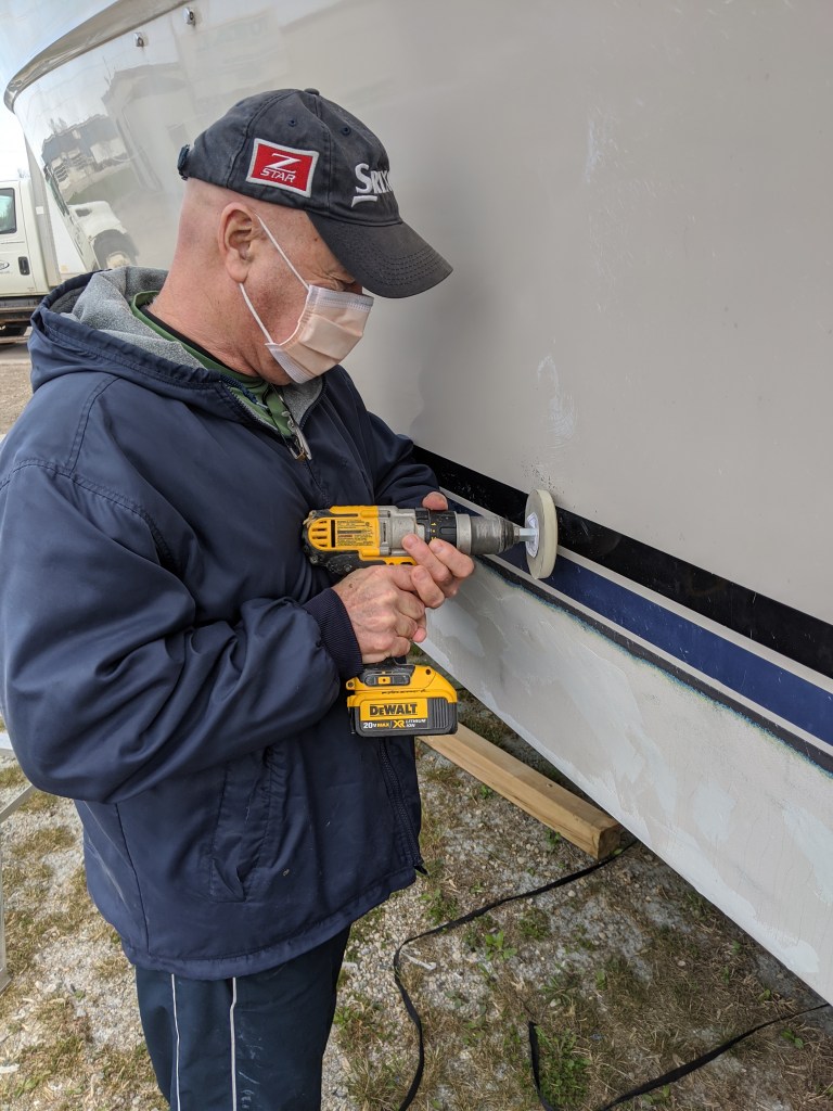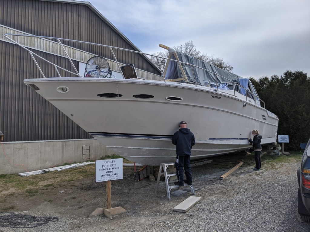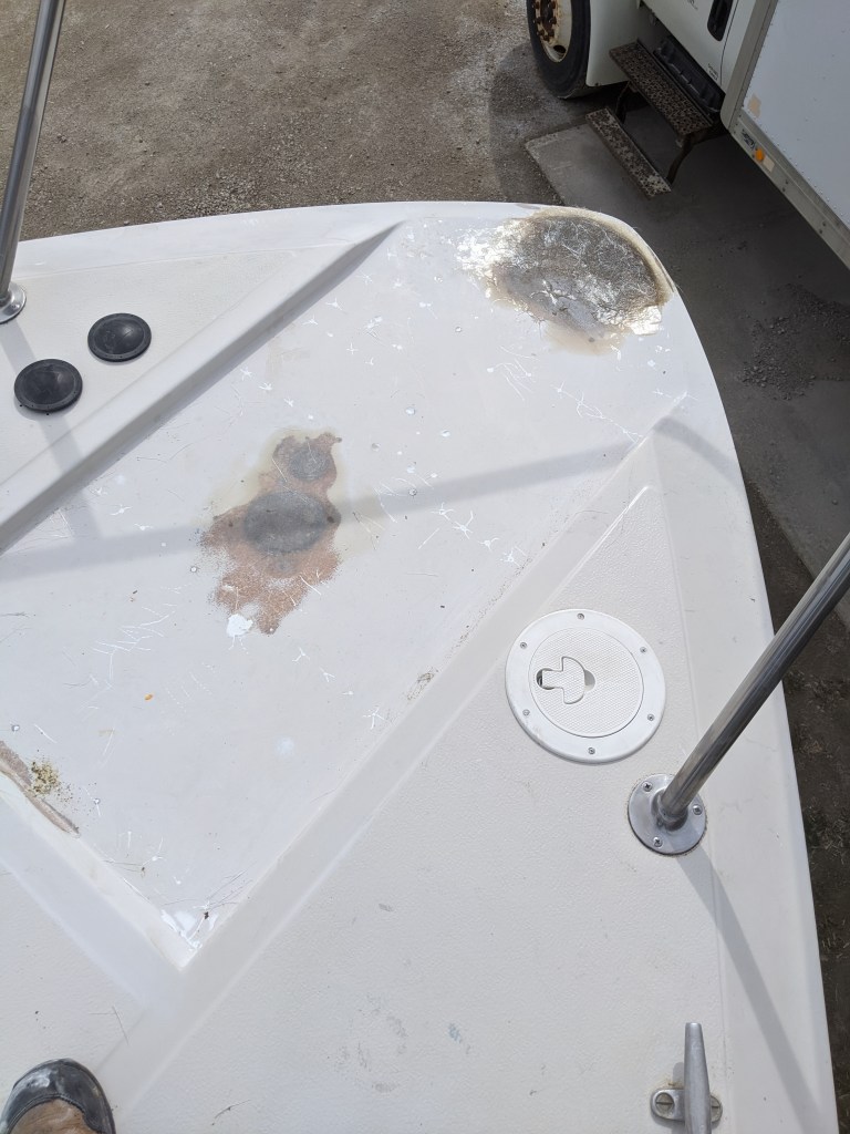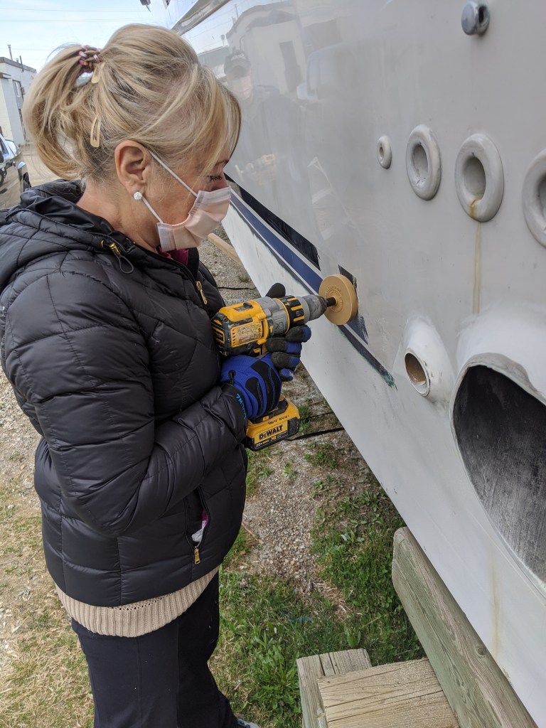 The sun came out later so they were able to start filling the small pockmarks in the gel coat on the transom. We are hoping to get the swim platform installed in the next few weeks so we will need to get that part of the hull primed and painted soon.