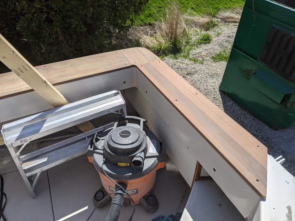 Since it was such a nice day we decided to do some work on the exterior. Donald spent some time fitting the Ipe cap on the transom.