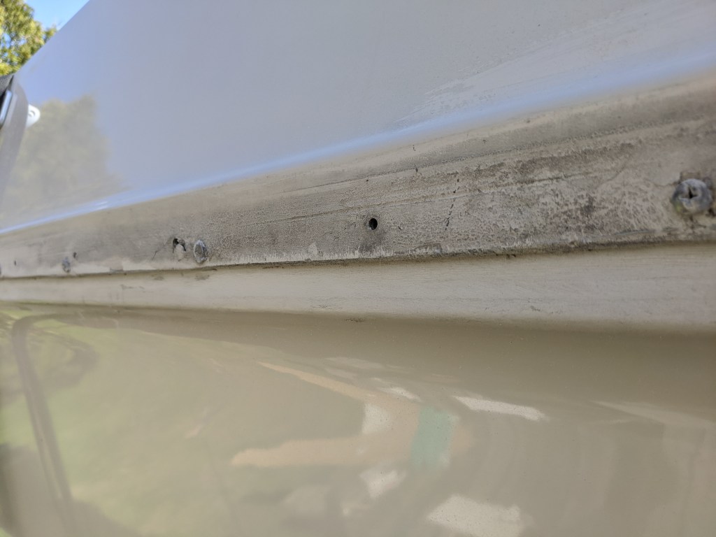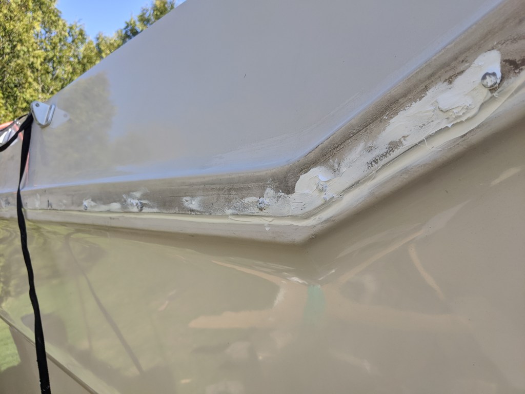 I started to reseal the gunwale and existing screw holes with white Sikaflex. It doesn’t have to look pretty since it will be covered with the hard rubber bumper rail.