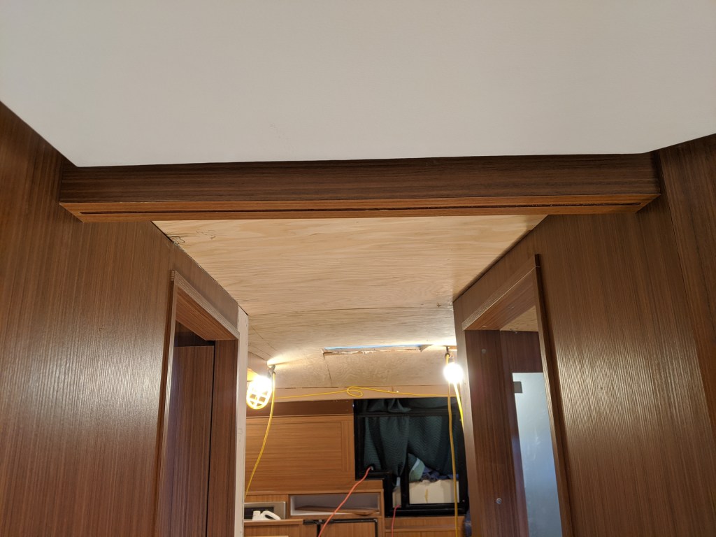 Donald worked on the area to the left of the electrical panel where the door closes in to. He built this area up with plywood to give us something to apply finished panels to. This is another area that we have to start building and see where it takes us.