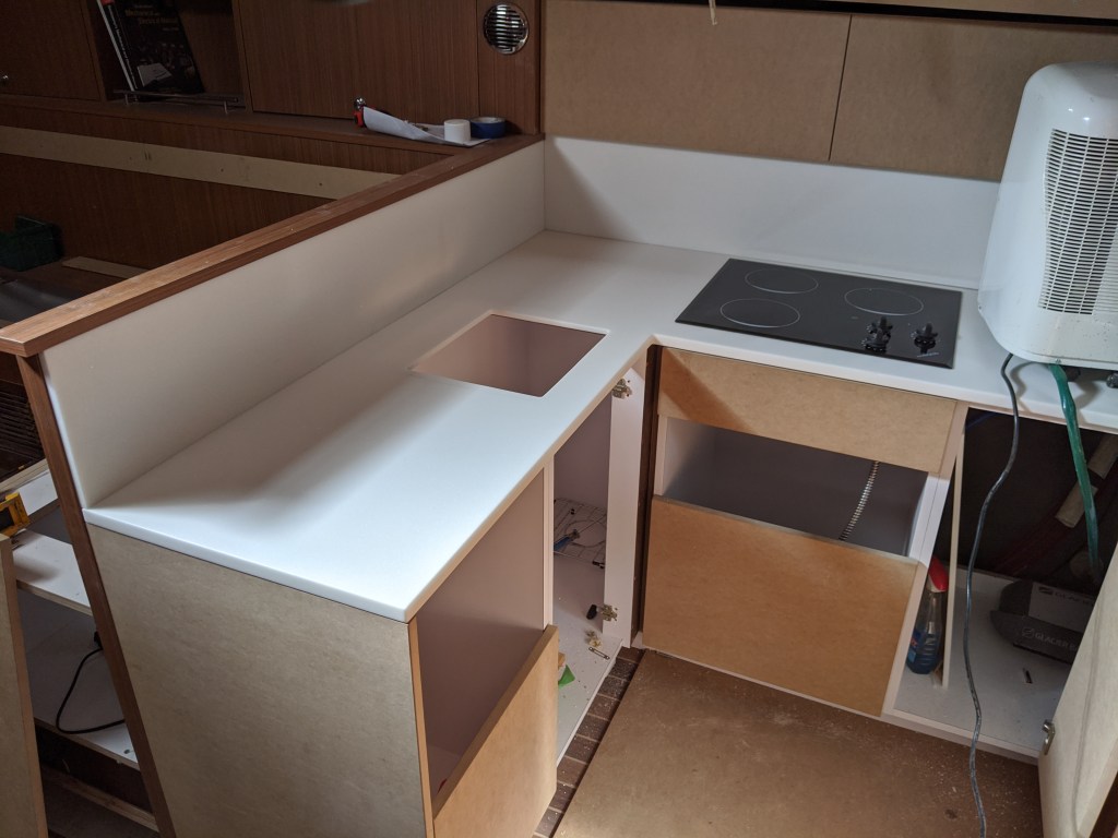 Another exciting development this week was the Corian counter top for the galley came in.