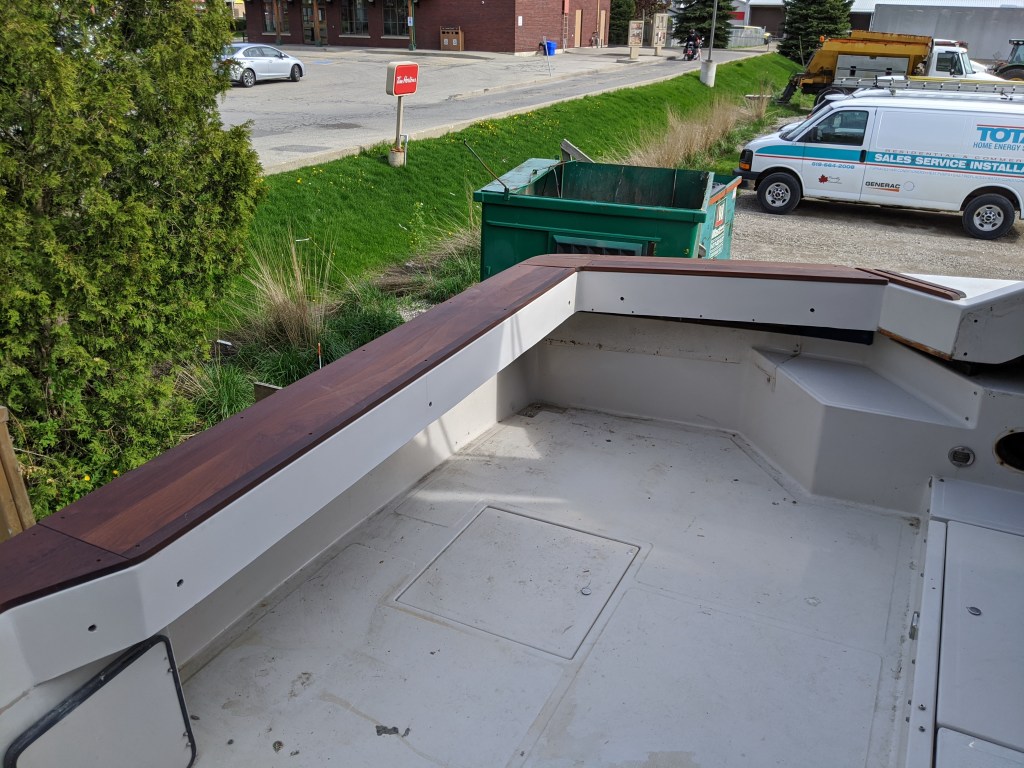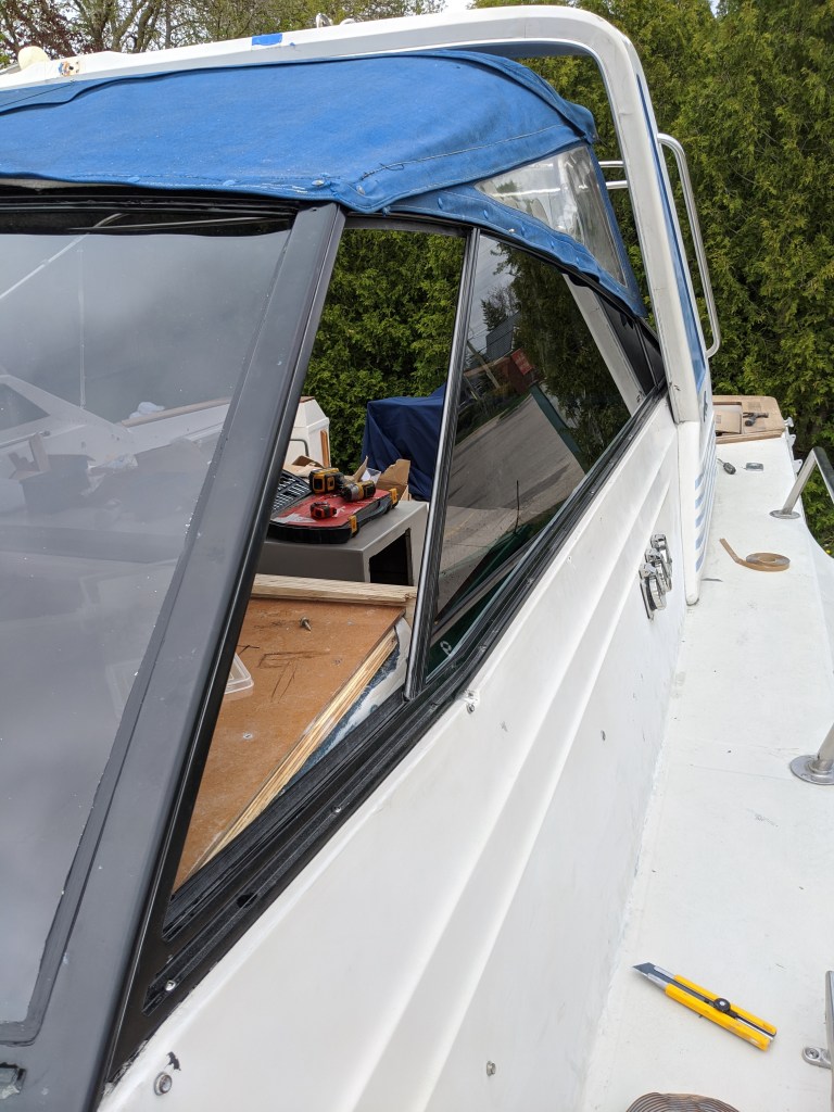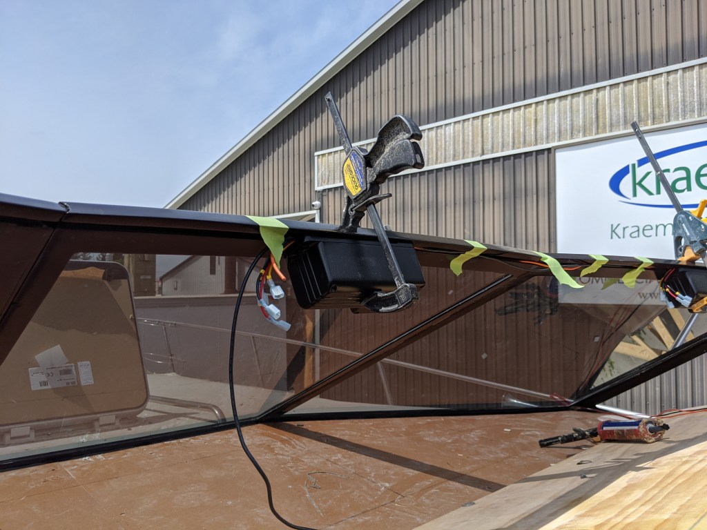 Donald spent much of the day on different things like finishing up the top cap on the transom, installing temporary panels in the sliding door, cleaning up the gunwale at the bow, and installing the rest of the windshield windows with me.
