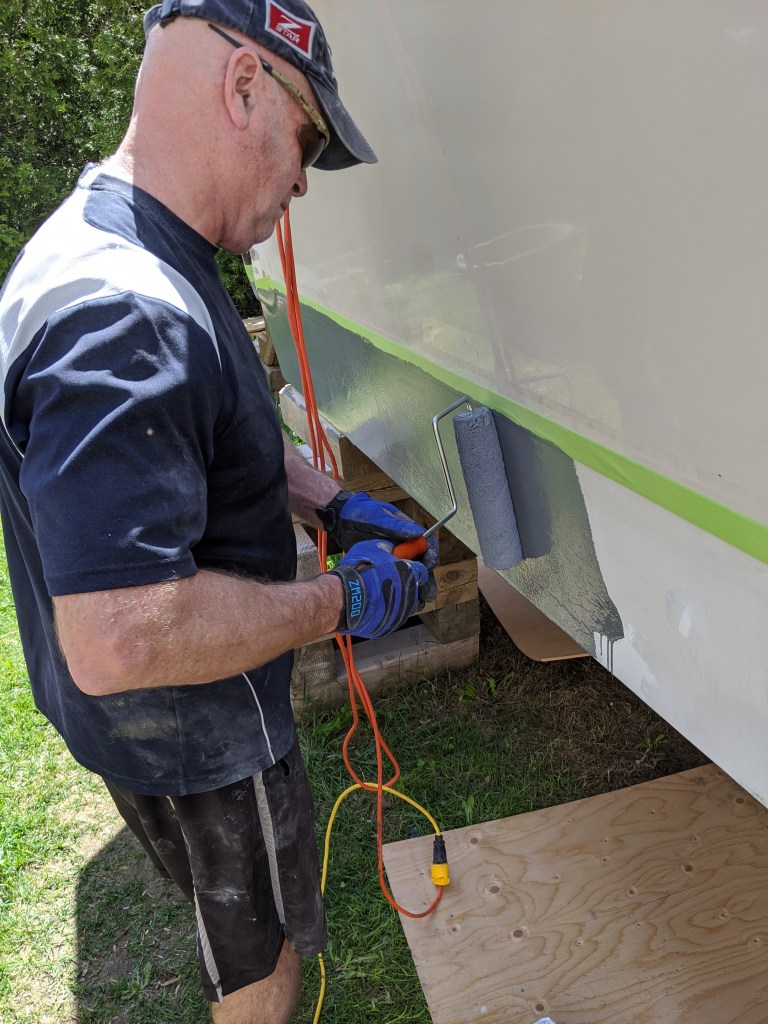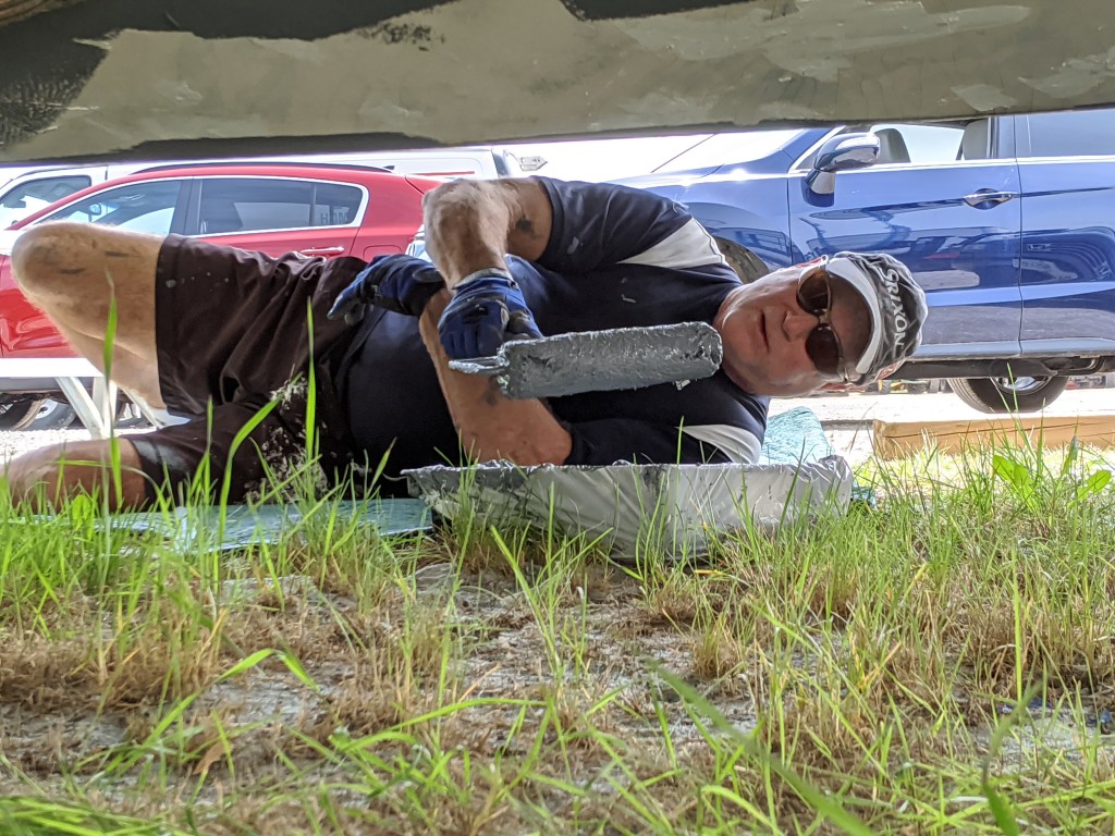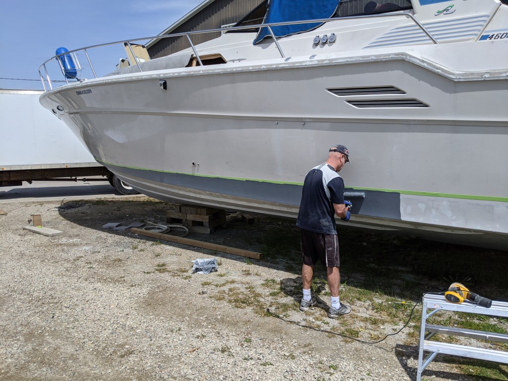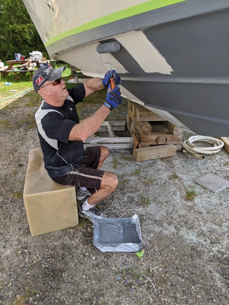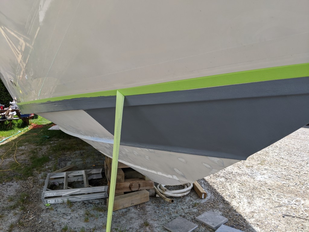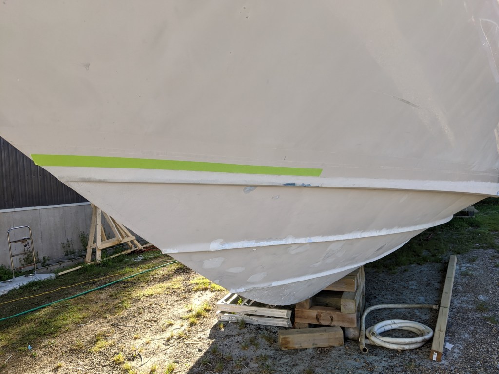 First thing on Saturday morning I put on 4 layers of tape to create the line of the anti-foul paint. This way when we paint each coat of primer and finish paint we can remove a layer and the paint won’t have basically glued the tape to the hull.