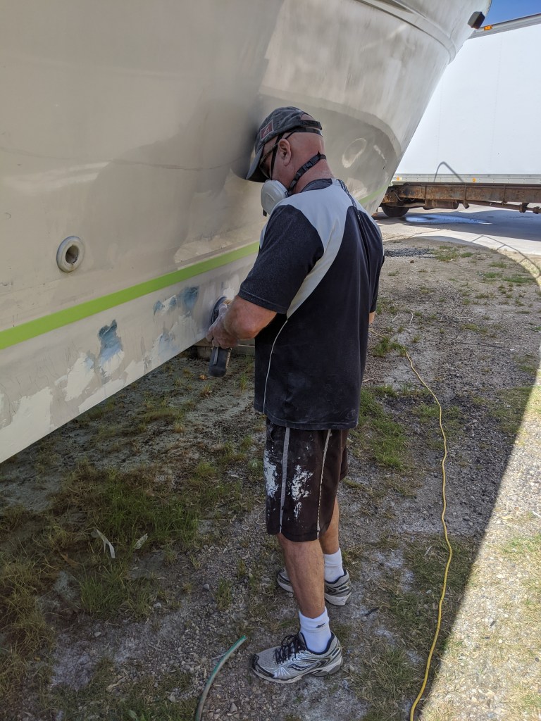 In this photo he is sanding the gel coat down to the fiberglass so that we have a good clean surface for the resin to bond to.