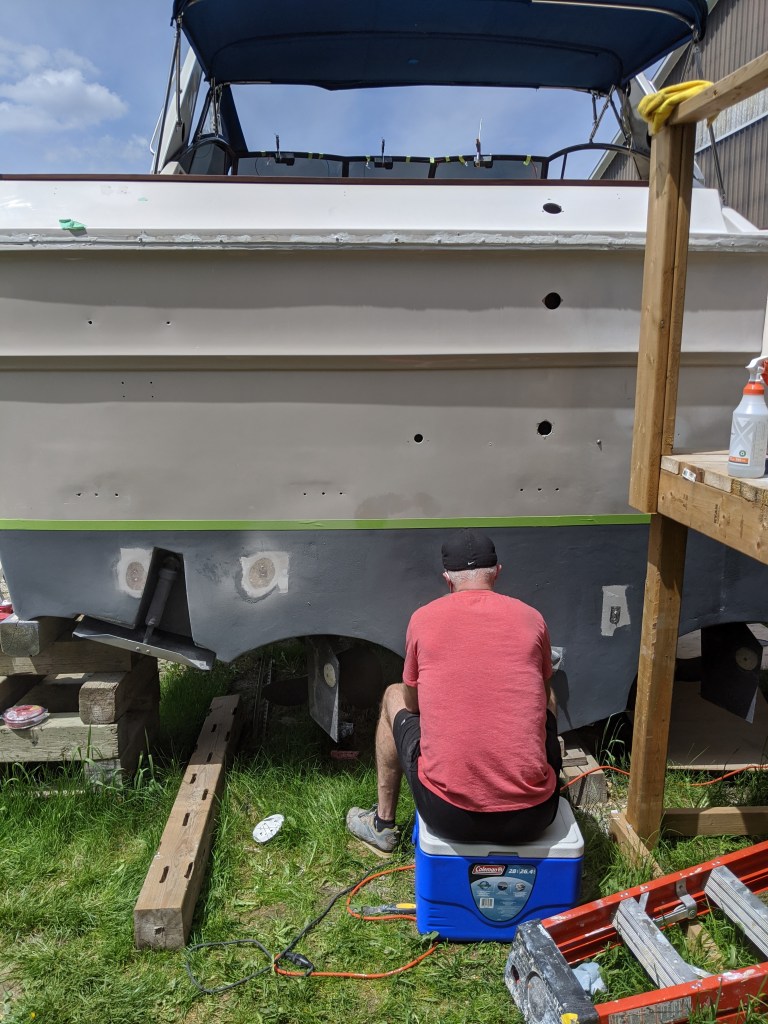 After we finished he patched the holes in the transom from the original bar supports for the swim platform. Since these will be underwater I had him put on two layers of fiberglass.