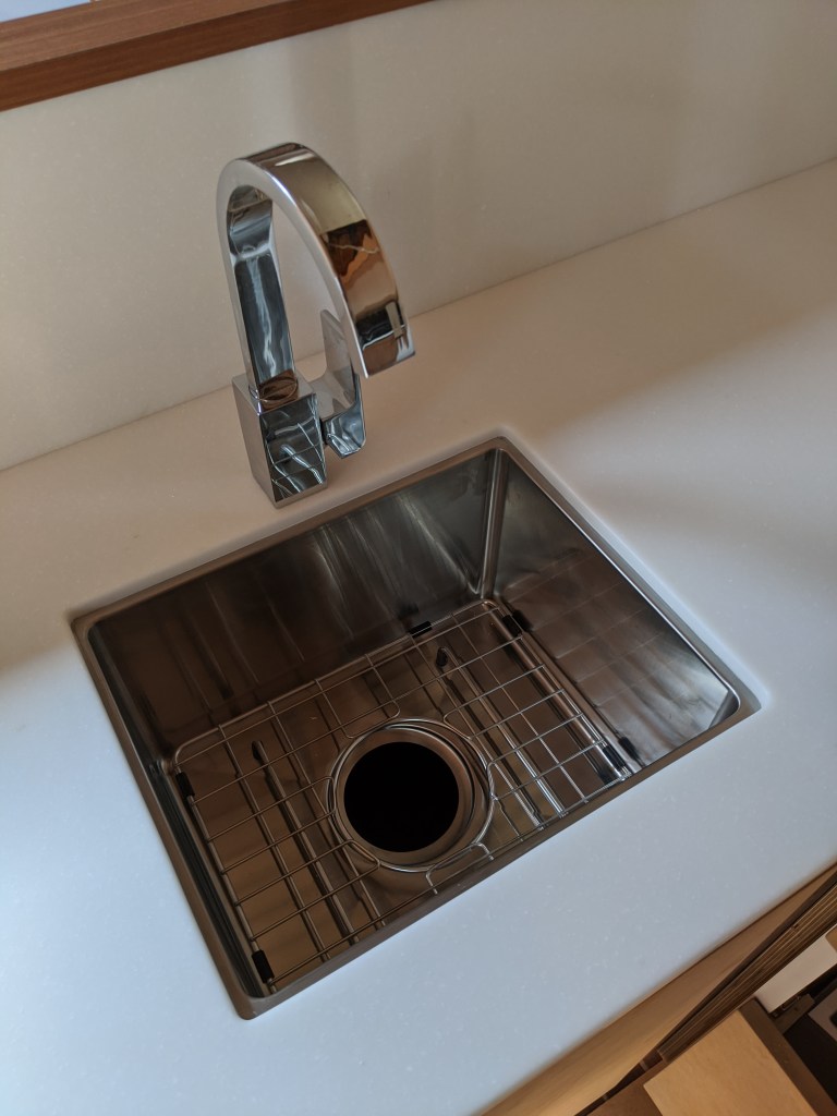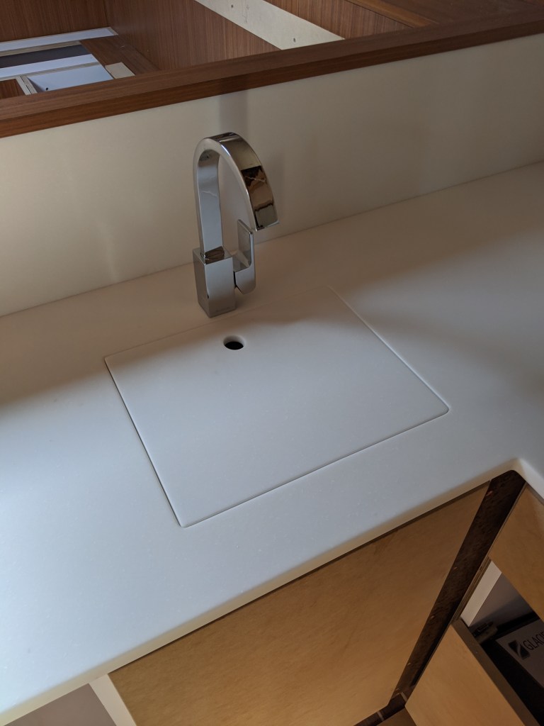 We were able to finish the installation of the galley top and also install the under mount sink.