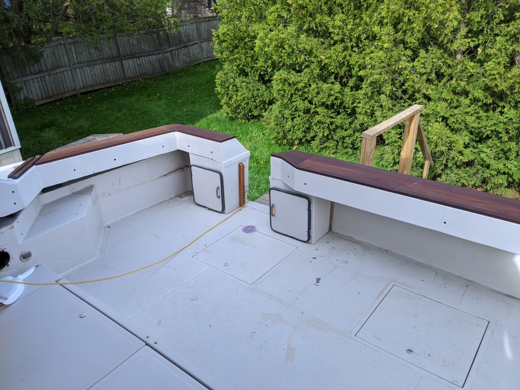 What I discovered as we were re-installing the support poles was that we were missing the 4 deck hinges that were attached to the teak on the transom.