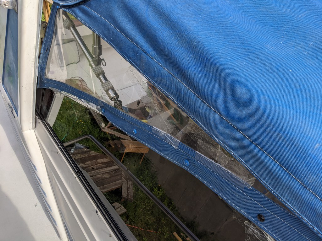 In this photo you will see the starboard side window. The packing tape covering the tears in the isinglass really adds class to our boat. It will look like this until the new bimini goes on.