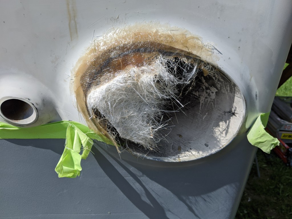 I also worked on the exhaust outlets at the stern. The gel coat and fiberglass had broken away over the years so I had to sand these spots down until I got to solid fiberglass. I learned my lesson about sanding fiberglass. If anybody ever installed insulation in their attic they will know what I mean.